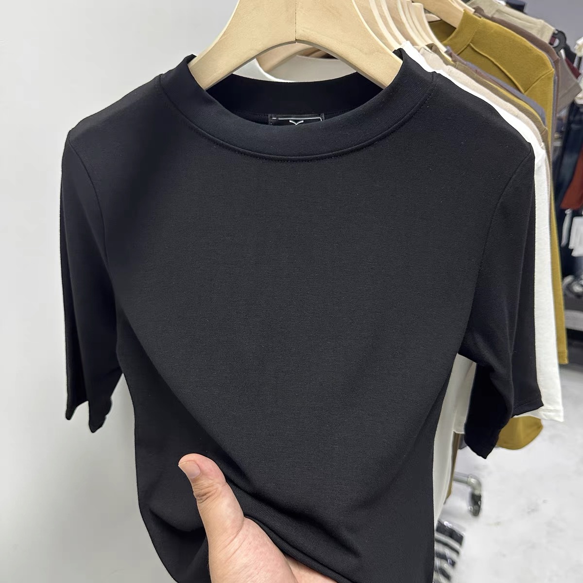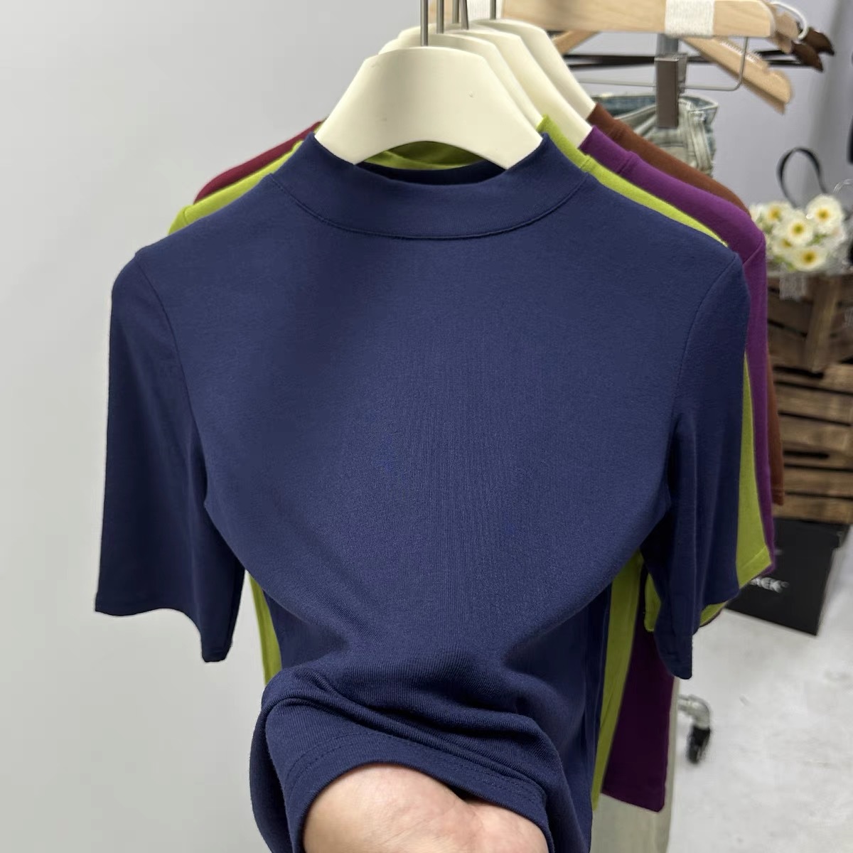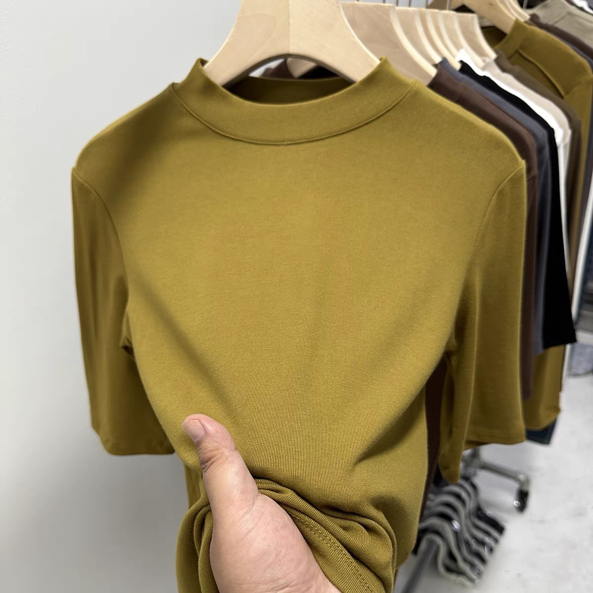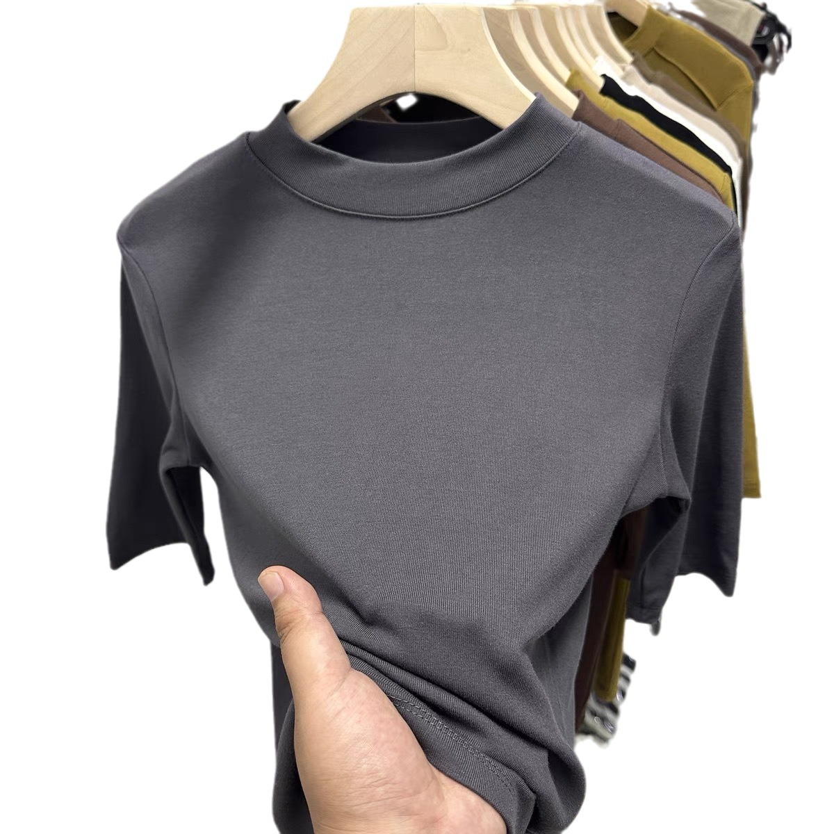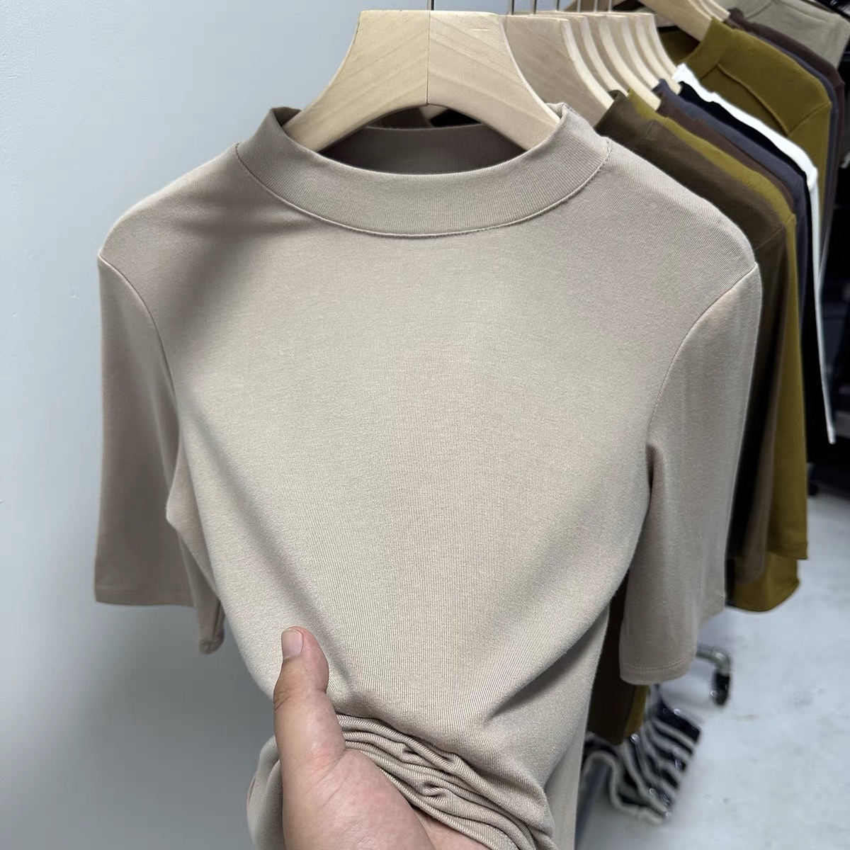 | nameOriginal | Wife of shop-owner with small stand collar sleeve T-shirt women's 2024 summer new versatile solid color half sleeve base shirt |