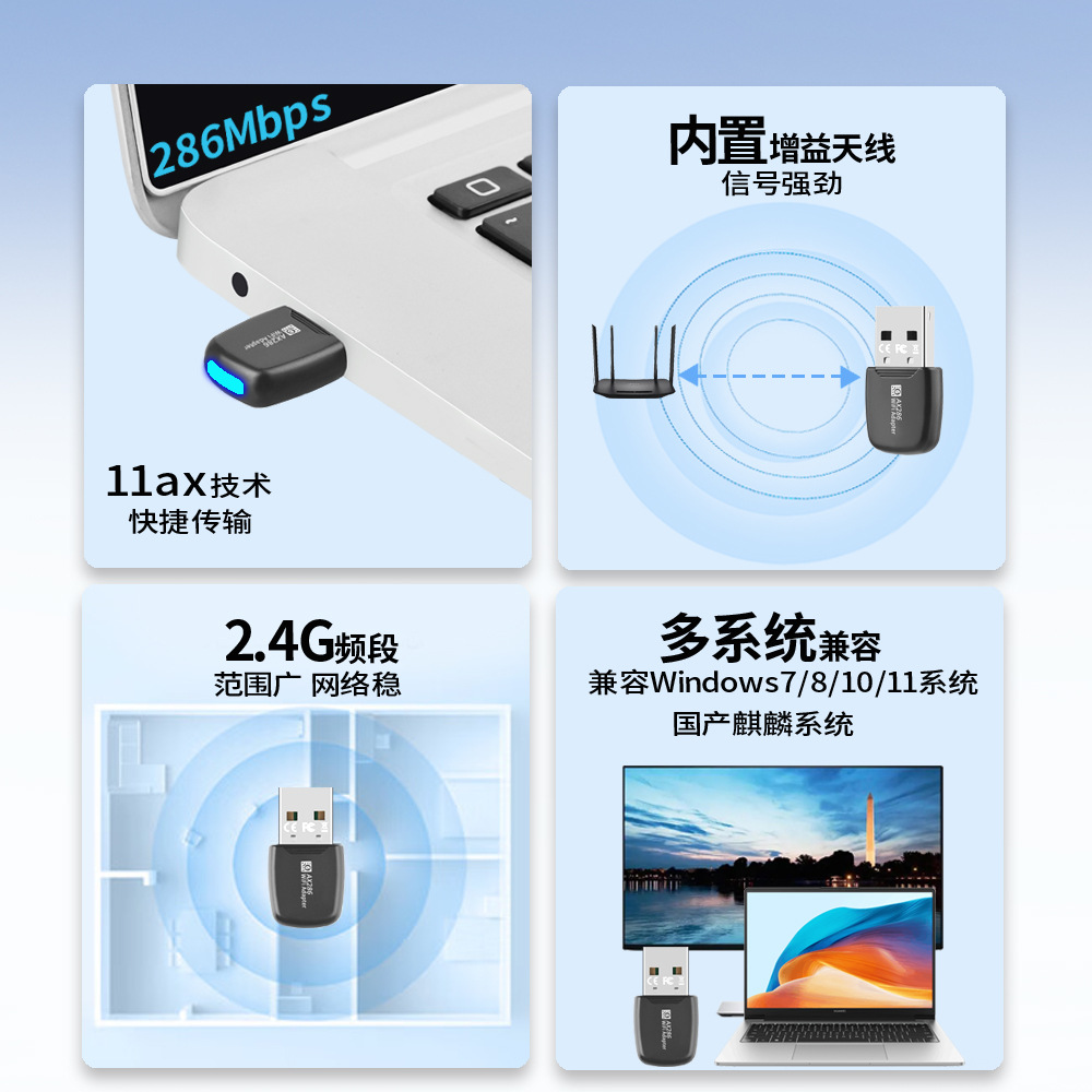 | nameOriginal | Wifi6 wireless network card driver-free 286M desktop laptop USB wireless WiFi receiver AP transmission |