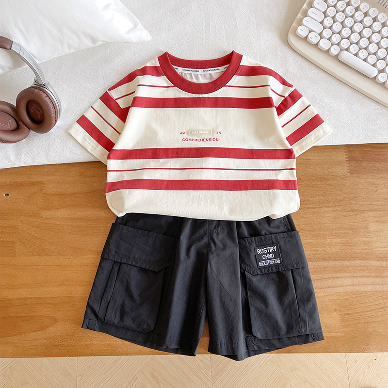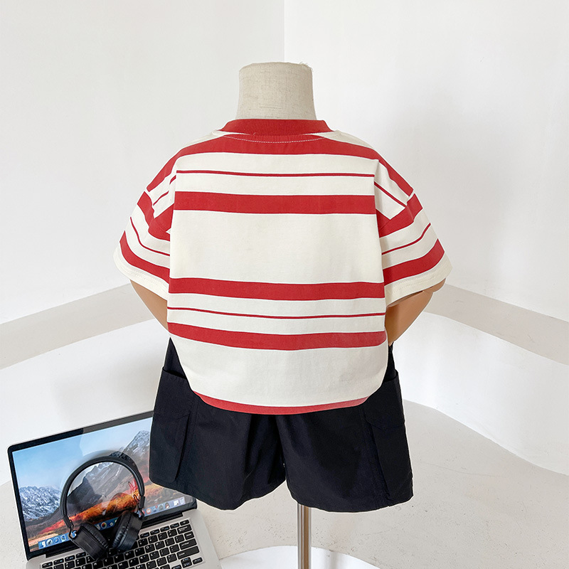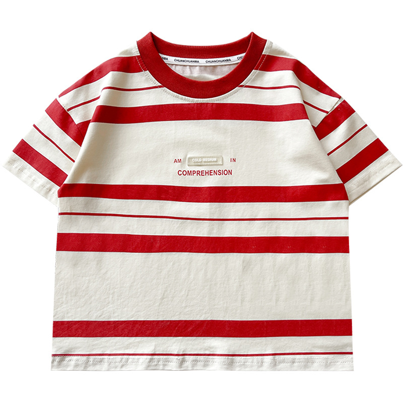Wind Valley 2024 Summer New Children’s Wear Korean-style Contrast Color Striped T-shirt for Boys and Girls All-match Letter Short Sleeve