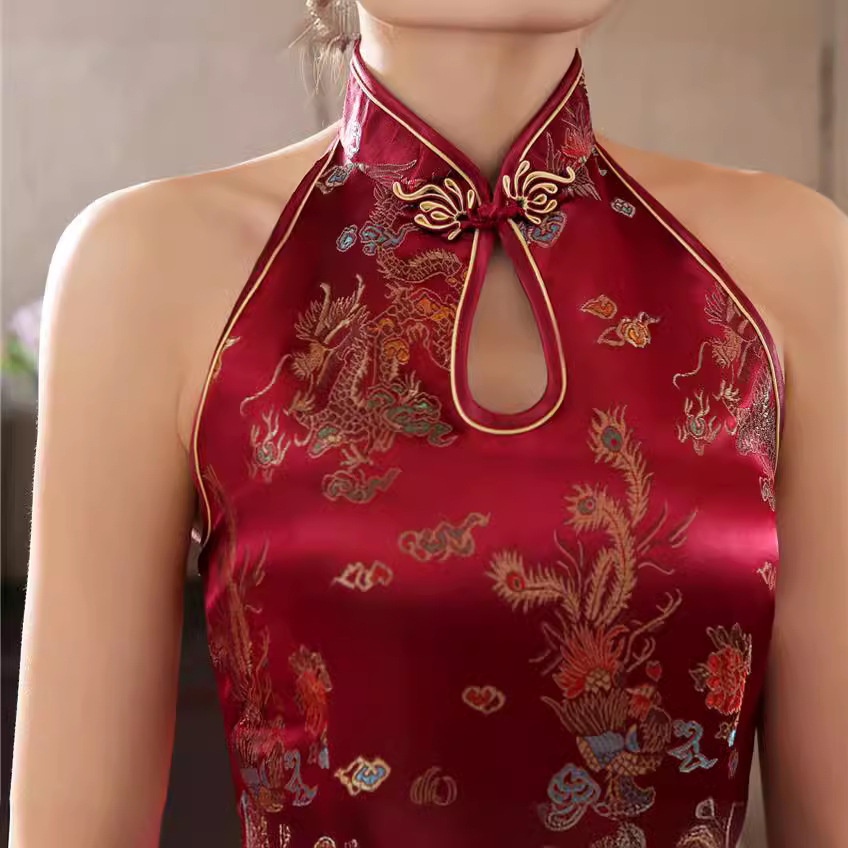 | nameOriginal | Wine red cheongsam long woven brocade cheongsam split cheongsam performance runway show evening party cheongsam Slim retro backless |