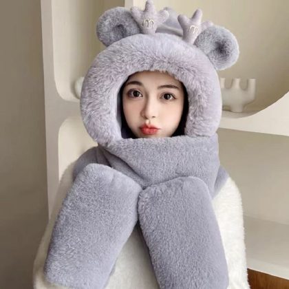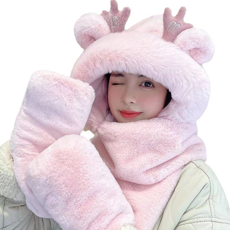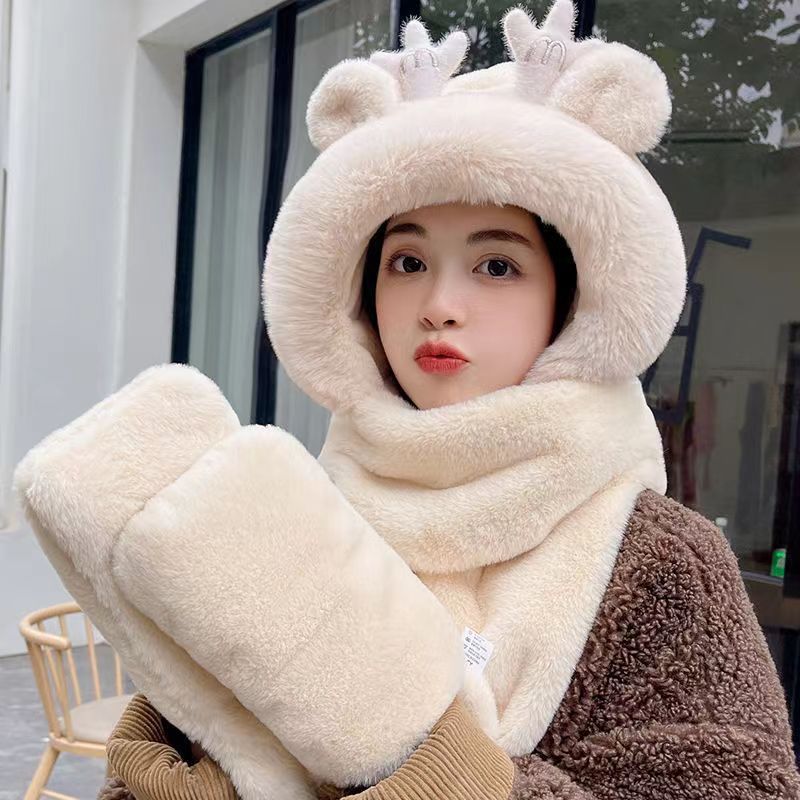 Winter Hat Scarf Gloves One Three-Piece Set Cute Longbao Antlers Thickened Warm Plush Hat Female Factory