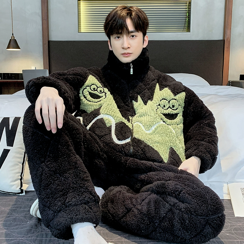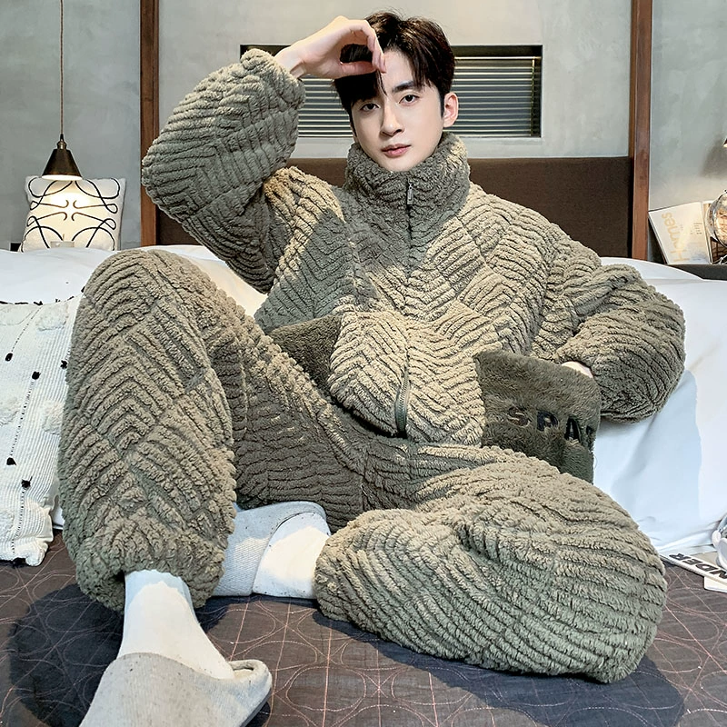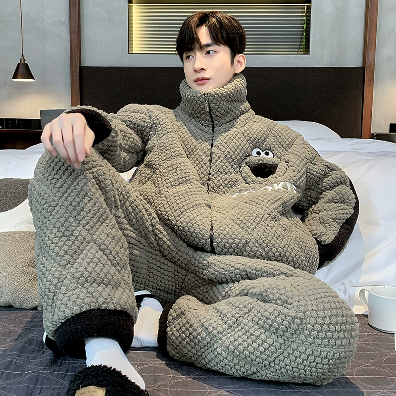 Winter -day men’s pajamas high -level sense thickened plus velvet three -layer cotton coral velvet men’s warm home service set