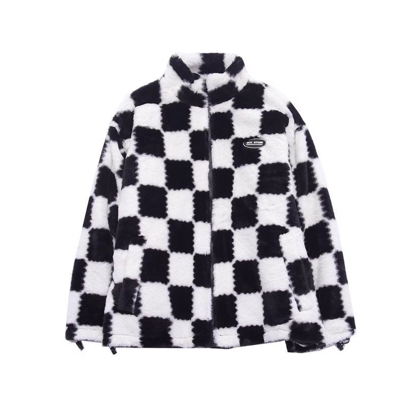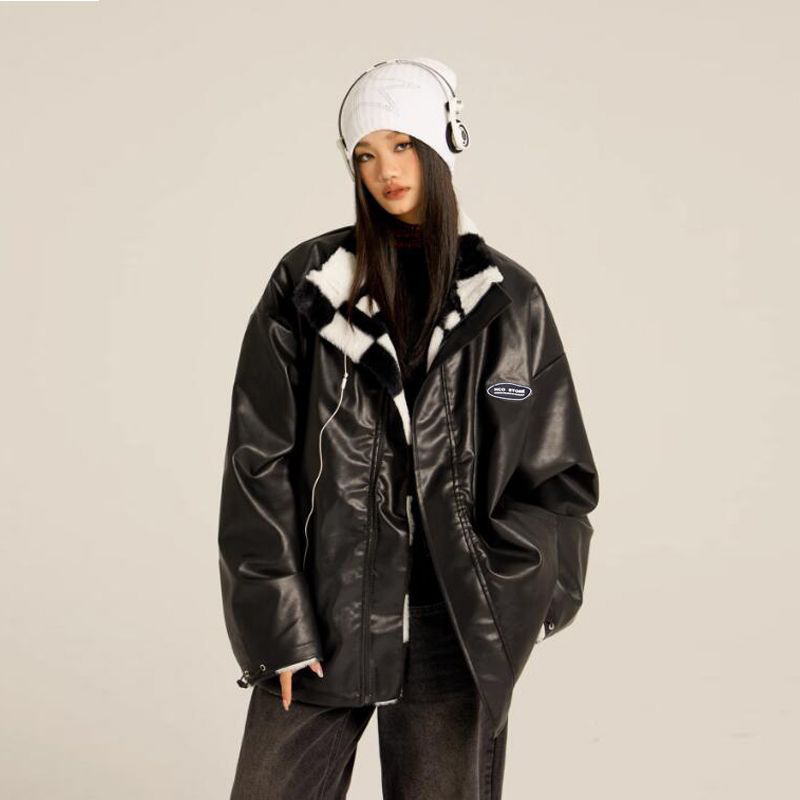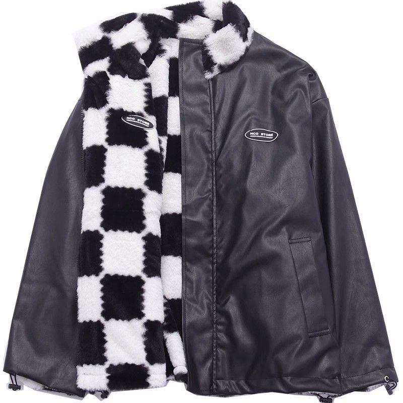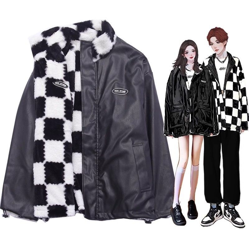 Winter retro design sense checkerboard pu leather plush two-sided wear cotton-padded jacket coat warm stand collar couple’s cotton-padded jacket tide