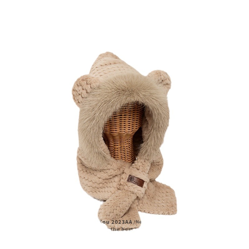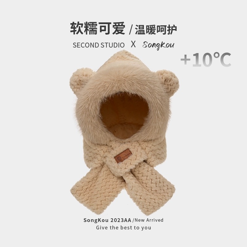 Winter Women's Warm Ear Protecting Fluffy Hat New fleece-lined Thickened Neck Protecting Cute Knitted Woolen Hat and Scarf