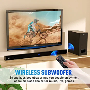 Introducing the Pyle PSBV28HB, a 35” 2.1 channel soundbar that comes with a wireless Bluetooth speaker and remote control. This soundbar features a built-in Class D stereo power amplifier, two 2” full-range drivers, and two 6.5” subwoofer drivers. It also has built-in BT technology, a 3.5mm auxiliary input, optical input, USB input, HDMI ARC input, and built-in LED lights.