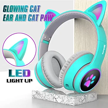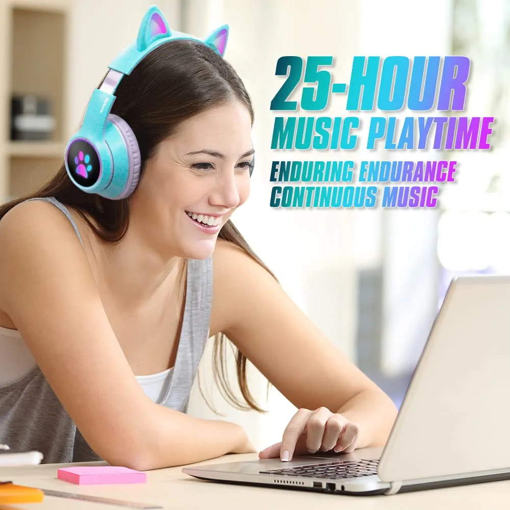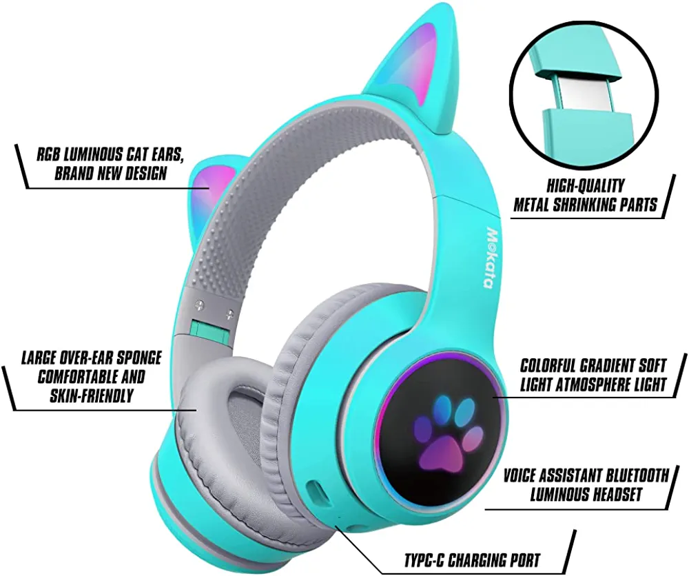 Mokata Gaming Bluetooth 5.0 Wireless Headphones Over Ear Cat LED Light Foldable Music Headset with AUX 3.5mm Microphone for Adult & Kids PC TV Game Music Pad Laptop Cellphone B12 Cyan