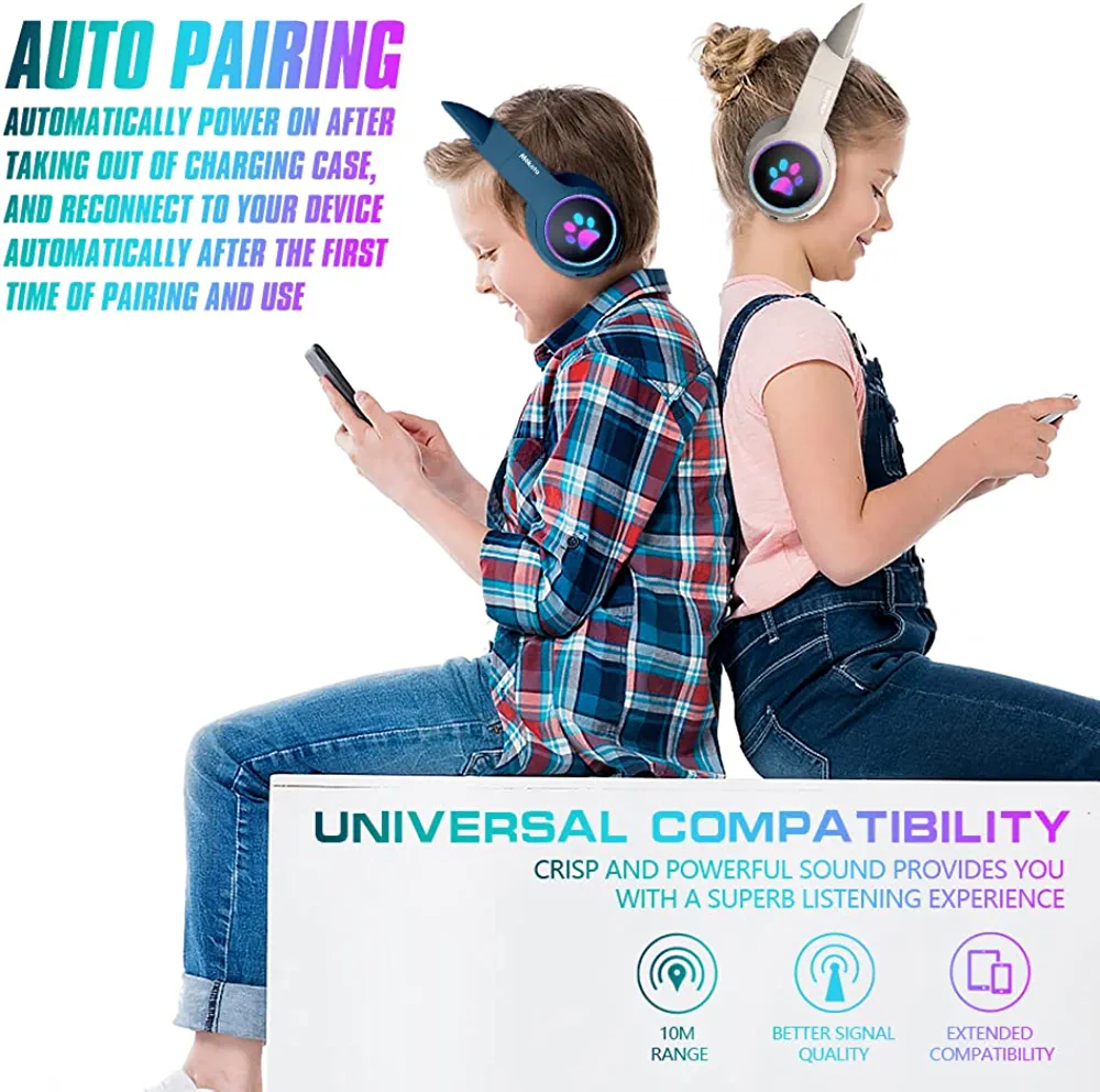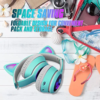 【Multifunctional Bluetooth 5.0 LED Light Cat Ear Headphones】: 8 hrs playtime Bluetooth headphones Built-in Microphone (hands-free calling) /Or AUX-IN.Your little ones can listen anytime in both a wired and wireless capacity. The wireless design is handy for avoiding tangles, a favorite feature of the big-kid panelists. However, the cord is detachable, minimizing a toddler's risk of getting snagged.