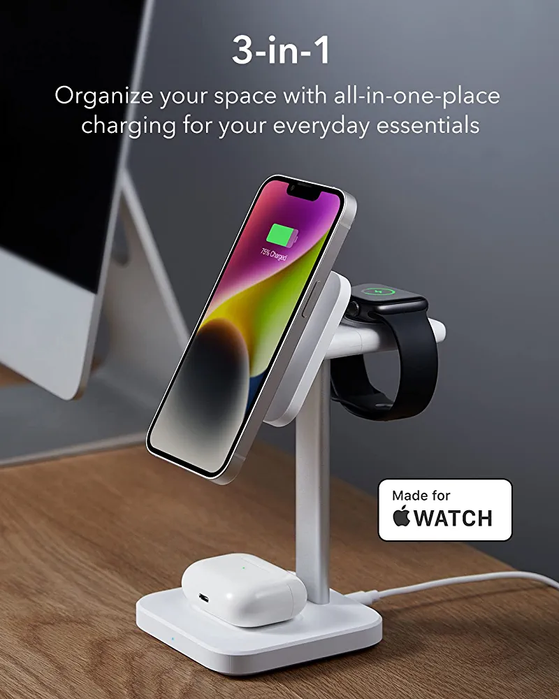 | descriptionOriginal | 3-in-1 MagSafe-compatible charging for iPhone and AirPods with magnetic charging for Apple Watch make charging all of your everyday essentials quick and easy. Keep your desk tidy, free up outlets, and get rid of cluttered wires with a complete all-in-one place charging solution. Quick-and-Easy Magnetic Charging Take the guesswork out of wireless charging, ditch the cable, and upgrade to tap-and-go MagSafe-compatible wireless charging. Strong magnets make perfectly-aligned fast charging as easy as attaching your phone to the charger, letting you charge your phone in the most convenient way possible: a snap. Made for Apple Watch Watch charger is officially Made for Apple Watch certified to ensure safe and reliable charging. Made for Apple Watch Watch shows in landscape or FaceTime in portrait at a more comfortable angle. Comfortable View HaloLock Car Charger Wireless Car Charger HaloLock Car Charger Wireless Car Charger MagSafe Battery Pack MagSafe Battery Pack HaloLock with CryoBoost 3-in-1 Wireless Charger Kickstand Wireless Charger |