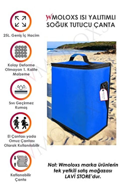 Wmoloxs 25 Lt. Cold Holder Thermal Insulated Picnic Camping Bag. Our new model heat insulated cold holder bag is a very practical product. You can keep your products cold for a long time by placing a frozen ice battery or ice bottle next to your drinks or food that you want to keep cold in the bag. It is foldable, it takes up almost no space when you don’t use it. Product Features: With its flexible and robust structure, it wraps your drinks and protects against external impacts. There is a suspension bracket for convenient carrying. Insulated fabric and reflective inner surface. Washable. Colour: Blue Dimensions: 40 x 32 x 20 cm, Volume: 25 Lt. Compact, lightweight and easy to carry. “AS A FAMILY OF LAVI STORE, WE WISH YOU TO USE IT ON HEALTHY DAYS”