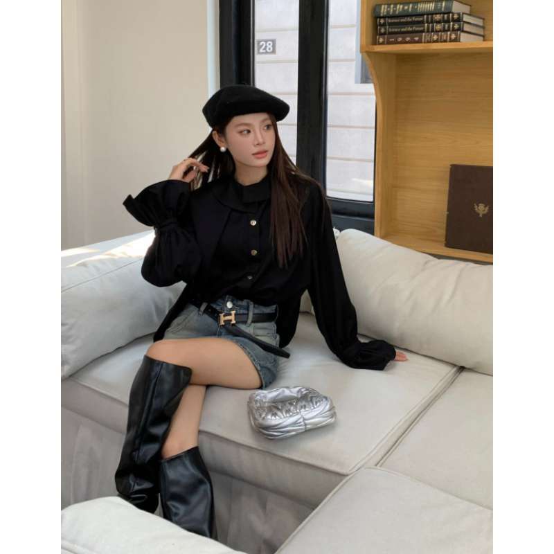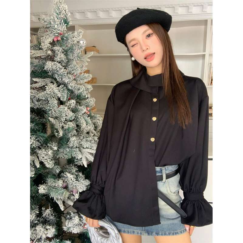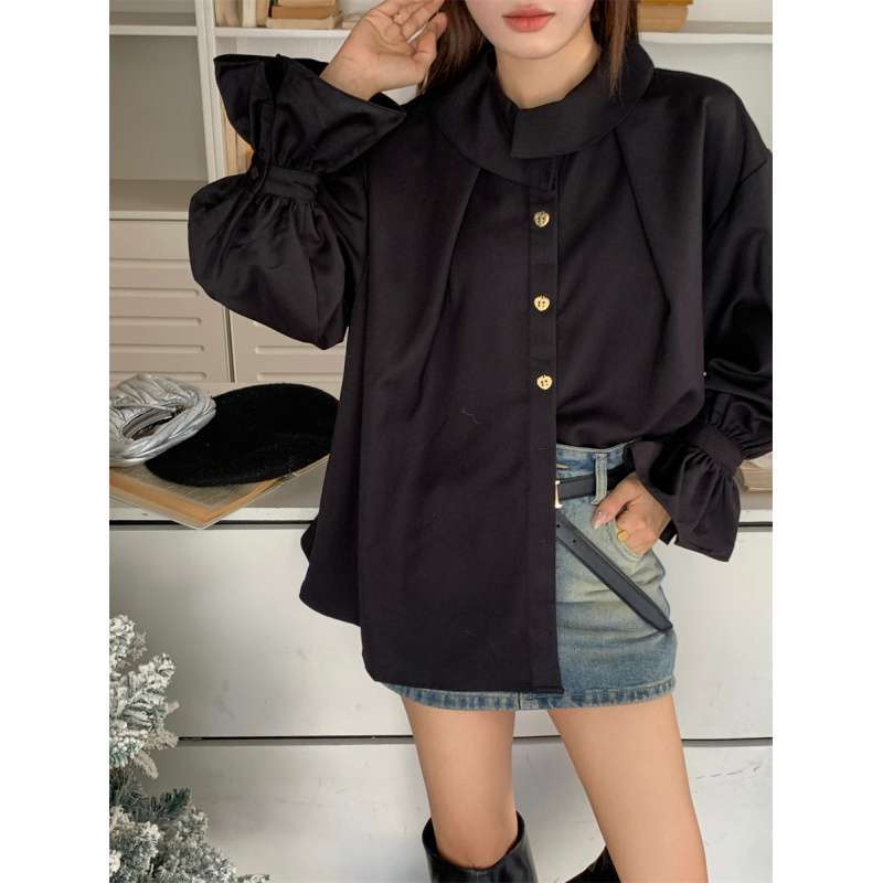 | nameOriginal | Wofanyi real shot! Dark style design irregular collar loose all-match bell sleeve shirt inner wear simple long |