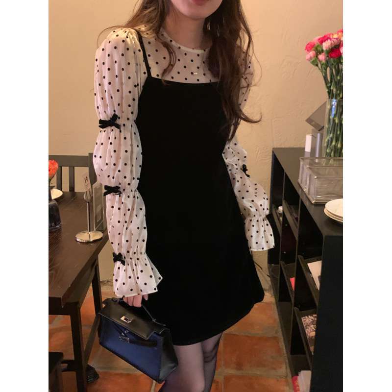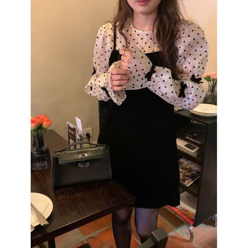 | nameOriginal | Wofanyi real shot Korean style cute age-reducing flocking polka dot puff sleeve bow + camisole velvet skirt |