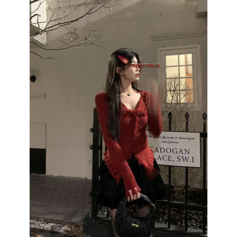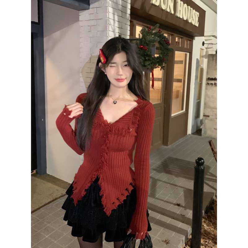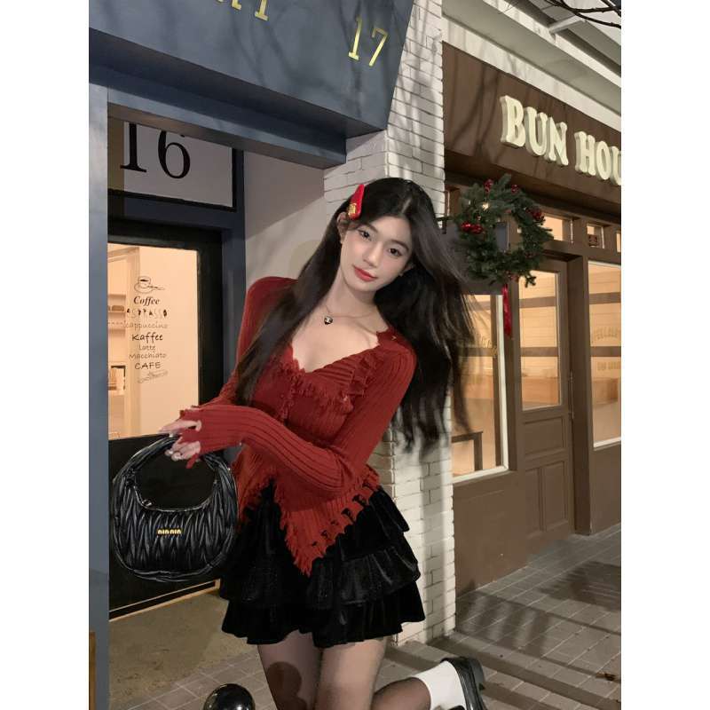 | nameOriginal | Wofanyi real shot real price red sweater V-neck slim bottoming shirt + velvet cake fluffy skirt |