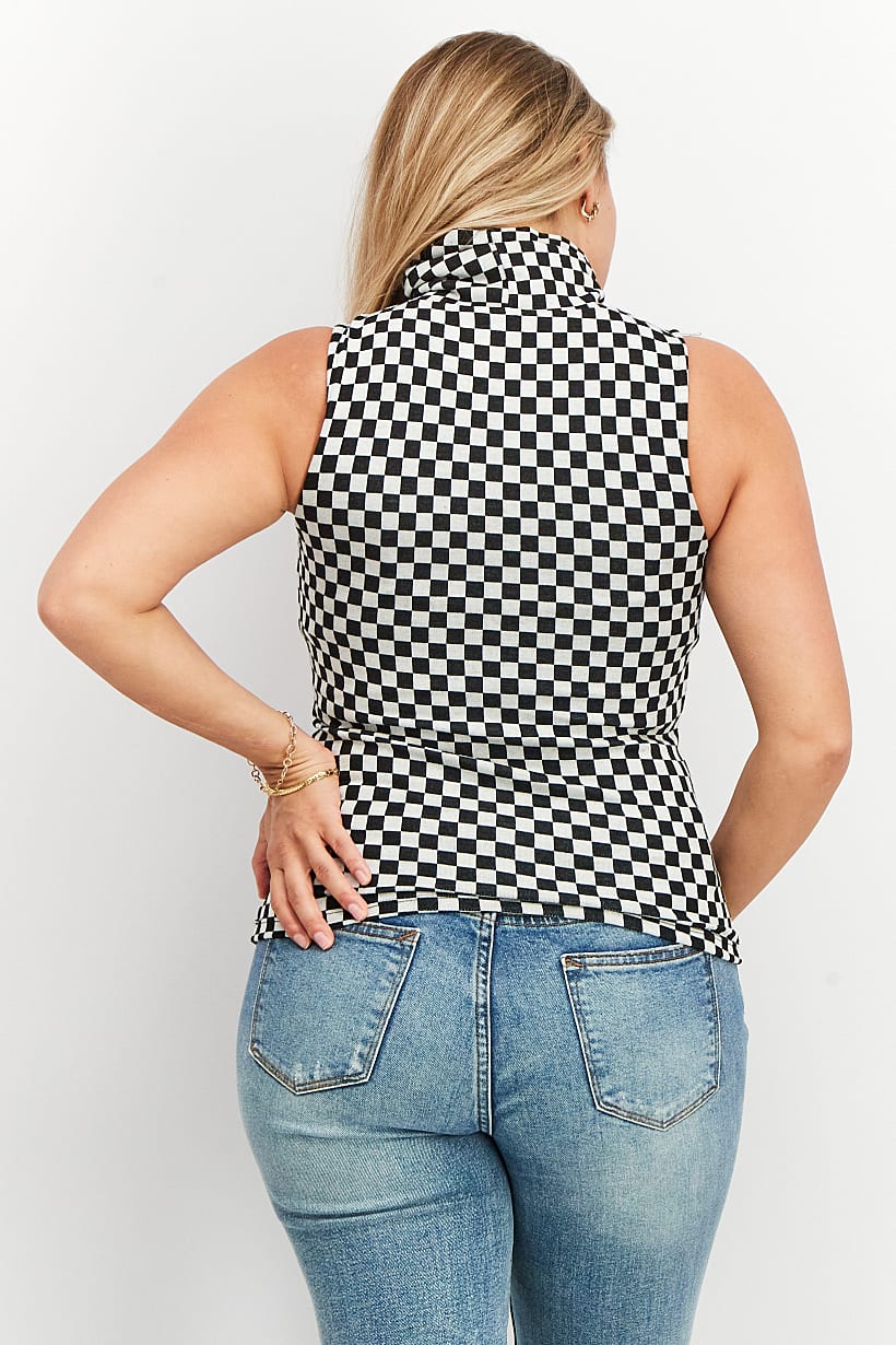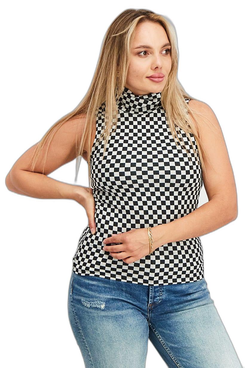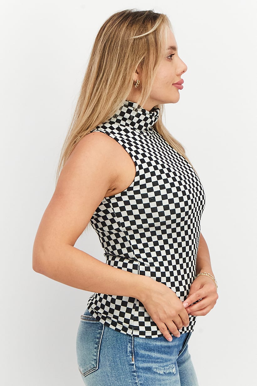 | nameOriginal | Women High Neck Sleeveless Checkered Tops, Black/White |