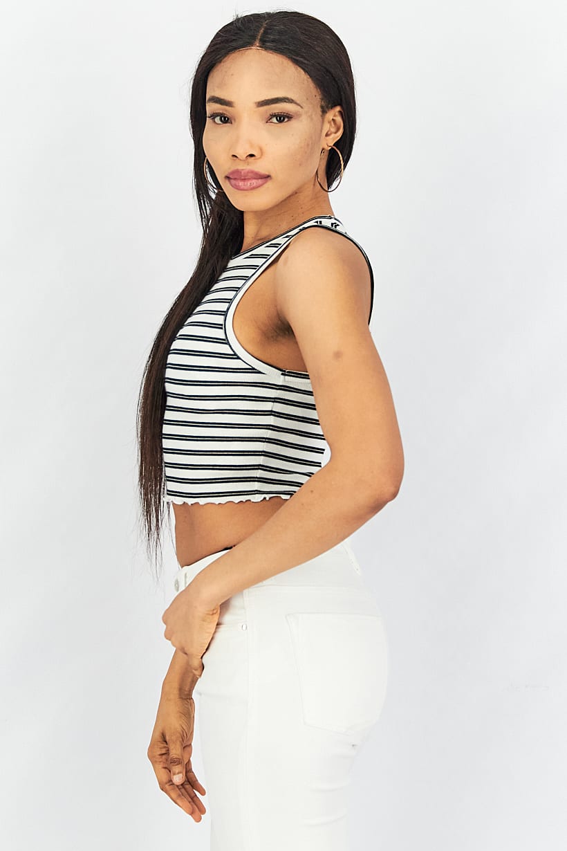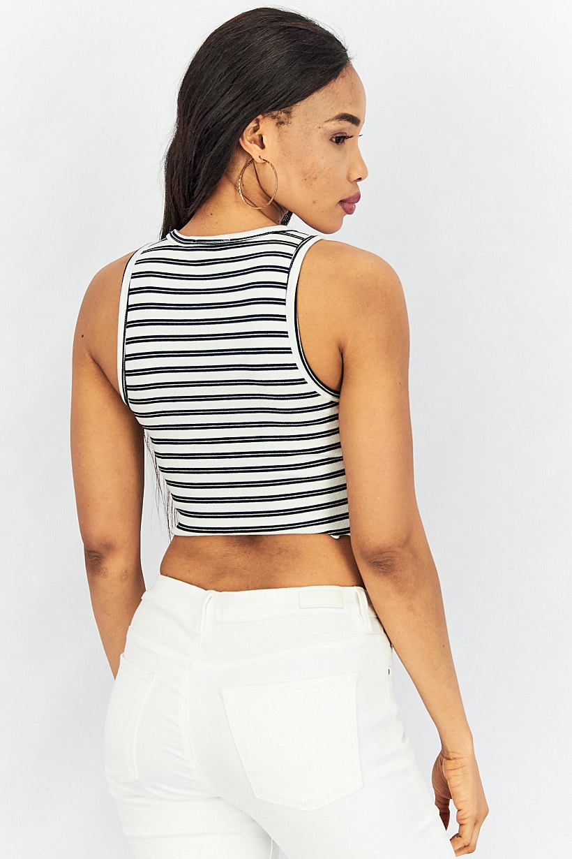 Care : Machine washable, Fit : Regular fit, Size shown : US, Top Style : Cropped, Types of Hem : Cropped hem, Types of Neckline & Collar : Round neckline, Types of Sleeve : Sleeveless, Fabrics : 58% Cotton, 37% Polyester, 5% Spandex, Occasion : Casual, Pattern & Print : Stripe, Types of Closures : Pullover, Color Family : Black,