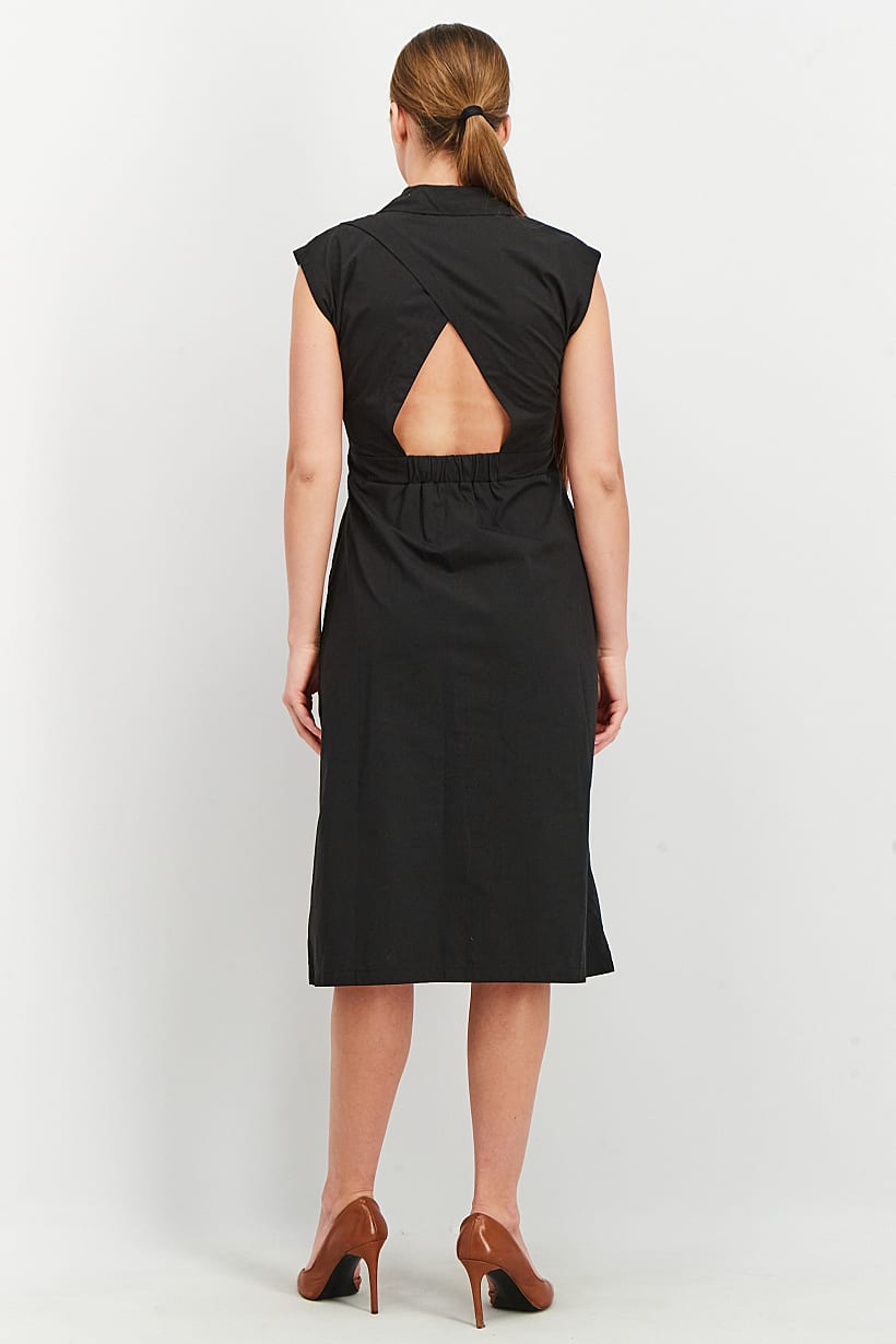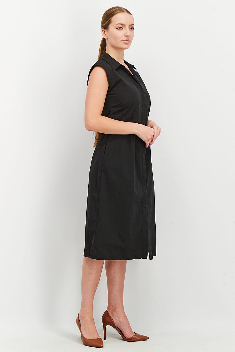 Care : Machine washable, Dress Style : Midi, Fit : Regular fit, Size shown : International, Types of Hem : Straight hem, Types of Neckline & Collar : Split neck, Types of Sleeve : Sleeveless, Disclaimer : Product color may slightly vary due to photographic lighting sources or your monitor settings., Fabrics : 55% Cotton, 45% Polyester, Occasion : Casual, Pattern & Print : Plain/Solid, Types of Closures : Button, Color Family : Black,