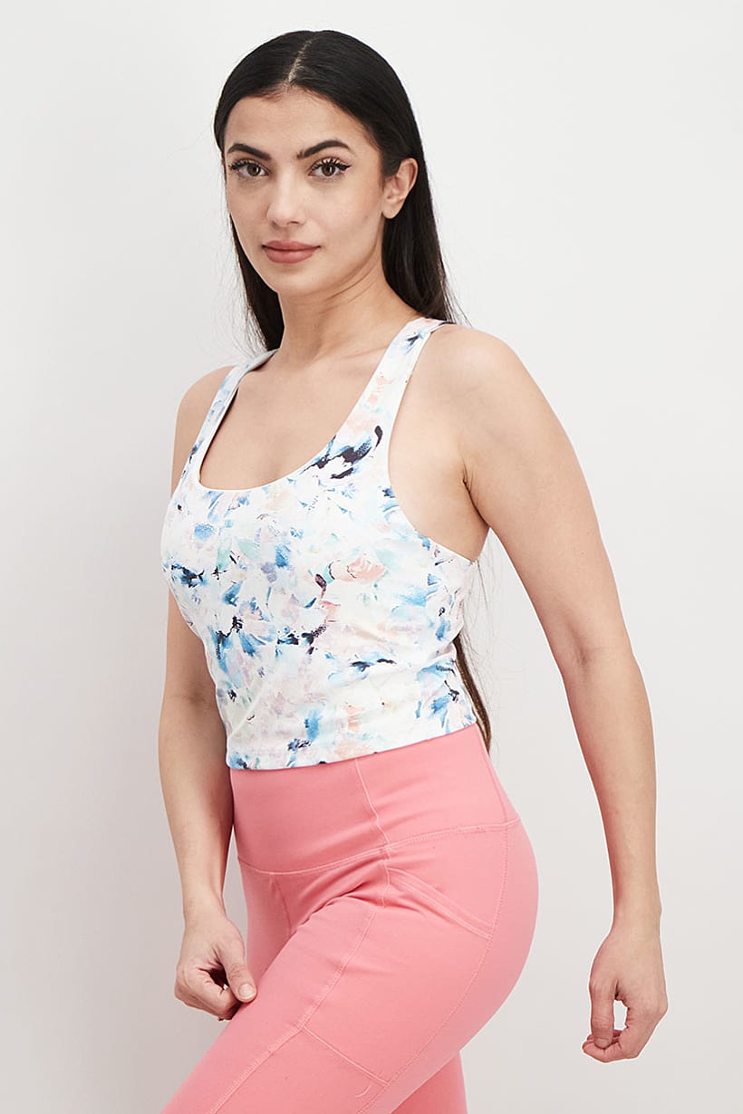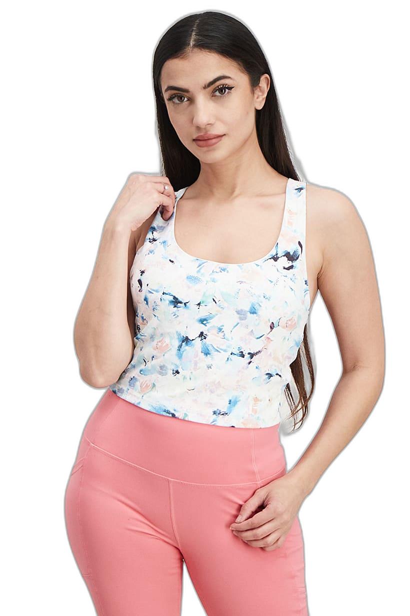 Care : Machine washable, Fit : Sportswear Fit, Ideal For : Women, Padding : Yes, Size shown : International, Sleeve Length : Sleeveless, Thickness : Light, Type of Sport : Training, Types of Hem : Straight hem, Types of Neckline & Collar : Scoop neckline, Types of Sleeve : Sleeveless, Disclaimer : Product color may slightly vary due to photographic lighting sources or your monitor settings., Fabrics : 78% Polyester, 22% Spandex, Pattern & Print : Allover print, Sportswear Type : Tops, Types of Closures : Pullover, Color Family : White,