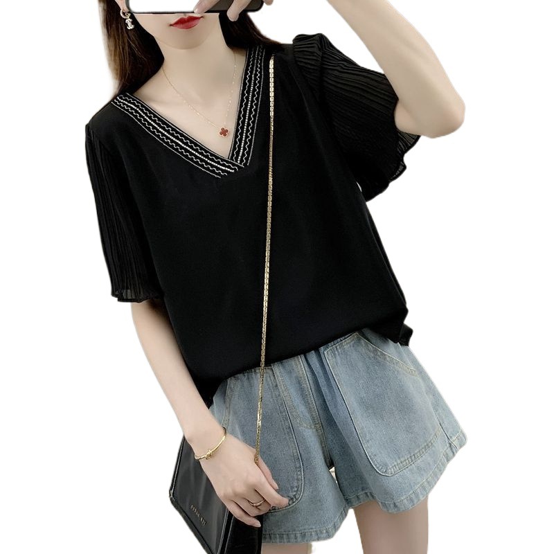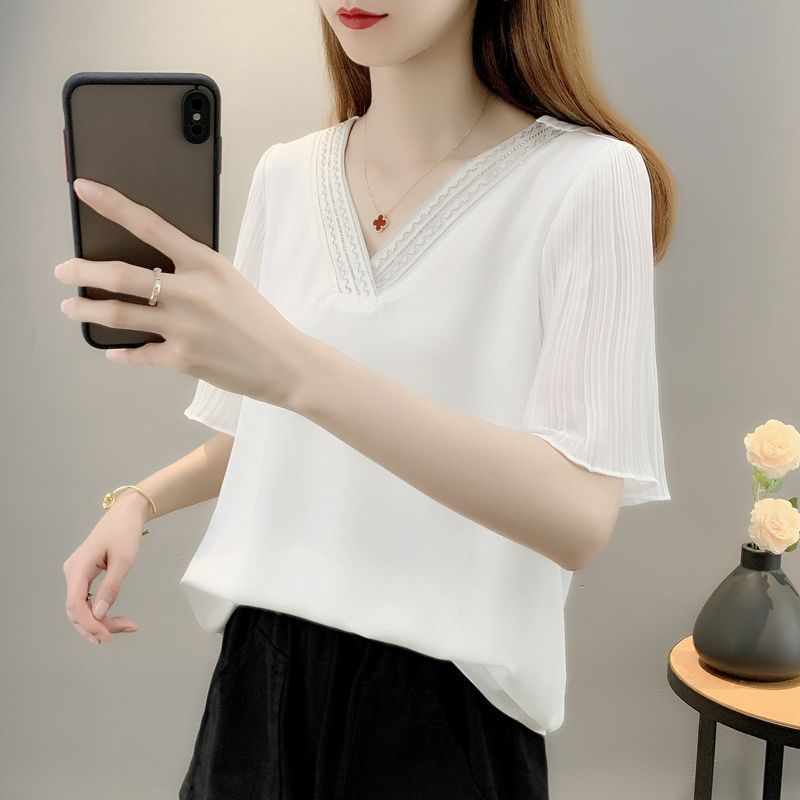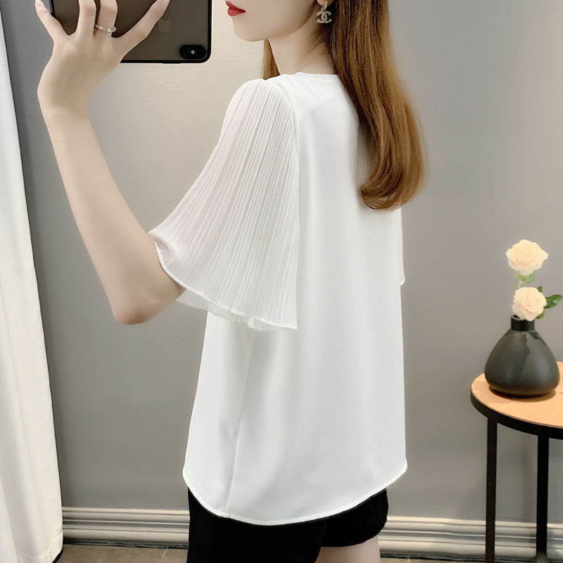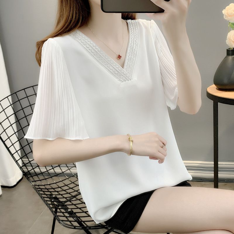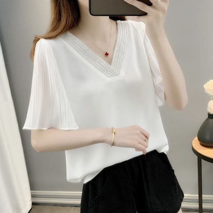| nameOriginal | Women's 2024 Short-sleeved Chiffon Shirt with Collar Horn for Summer New Korean Style Thin Loose Slimming Solid Color Top Trendy T-shirt |
