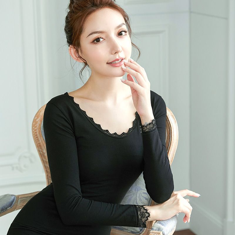 Women's Autumn Clothes and Pants suit Base Thin plus size Low Neck Slim-fit Inner Wearing Thermal Underwear Cotton Sweater for Women