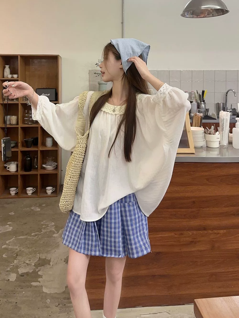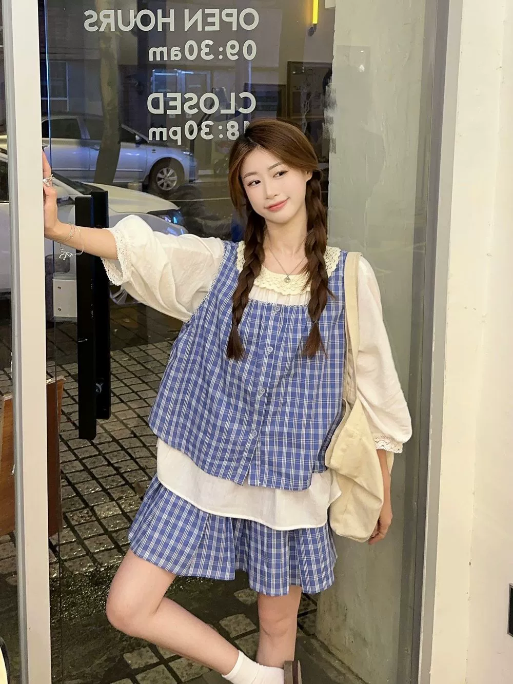 | nameOriginal | Women's blue plaid pleated skirt summer lace |
