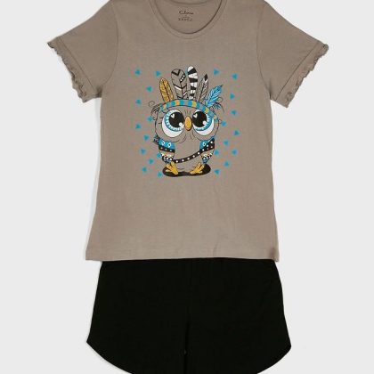 This product is a cozy and comfortable set of pajama top and bottoms made from high-quality cotton fabric. The top features a round neckline and short sleeves, while the bottoms have an elasticated waist for a snug fit.