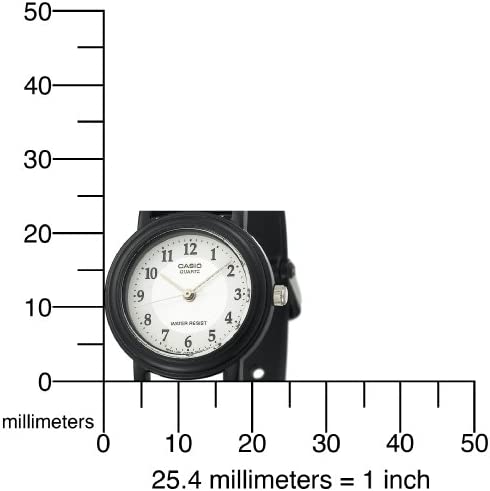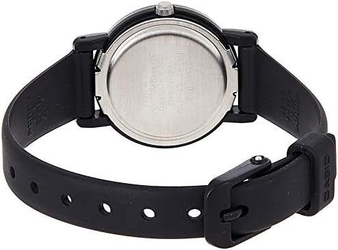 This Casio watch features a durable resin band and glass, making it resistant to water damage. It also has regular timekeeping with three analog hands for hours, minutes, and seconds. The battery life lasts approximately three years with an SR626SW battery. Please note that the image shown may not be the exact model available for purchase.