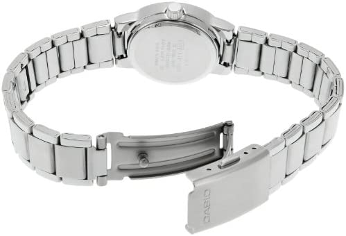 The Casio Enticer Women’s Analog Watch in LTP1230D-1C features a sleek black dial and is made of durable stainless steel. The case and bezel are ion plated, while the band is a stainless steel one with a one-touch 3-fold clasp. This watch is also water-resistant, making it perfect for everyday wear. Additionally, it has a weight of 55 g and a reliable power supply with a long battery life.