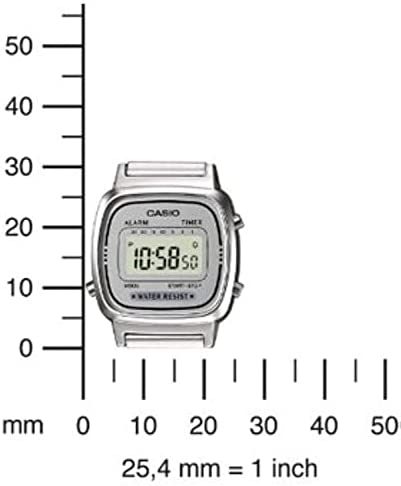 Introducing the Casio Women’s Quartz Watch with a sleek digital display and a durable stainless steel strap, model LA670WA-7SDF. The watch boasts a compact case size of 30.3mm x 24.6mm x 7.3mm, made with high-quality resin and chrome plating. It is also water-resistant, making it perfect for everyday wear. The watch is lightweight, weighing only 26g, and features an adjustable clasp for a comfortable fit. Elevate your style with this elegant and functional timepiece.