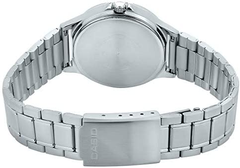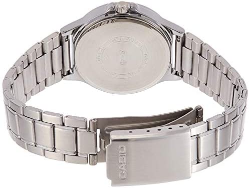 This watch comes with a triple-fold clasp and a stainless steel band that ensures durability and longevity. The mineral glass protects the watch from scratches and damage. It is water-resistant, making it suitable for everyday use. The watch has regular timekeeping and features an analog display with three hands for hours, minutes, and seconds. It also has three dials for date, day, and 24-hour time. The watch has an accuracy of ±20 seconds per month and a battery life of approximately three years on SR920SW.
