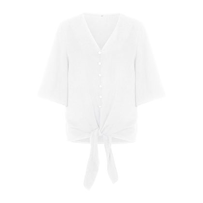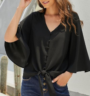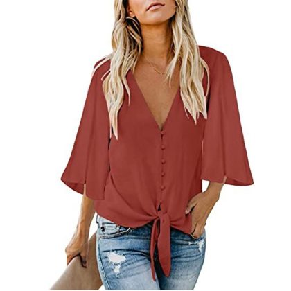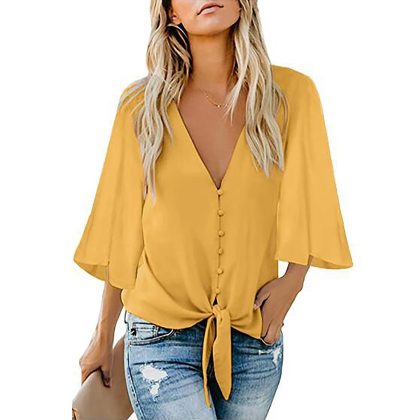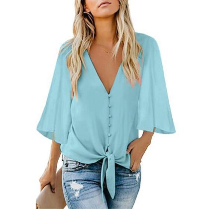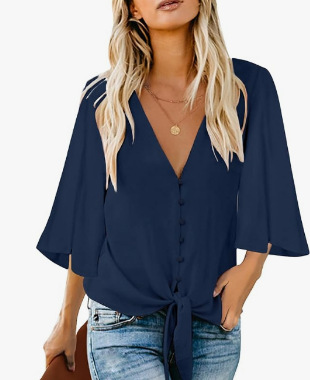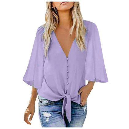 nameOriginal | Women's casual shirt Amazon hot selling tie button top V-neck solid color shirt 2024 spring European and American |
