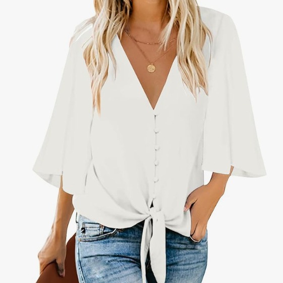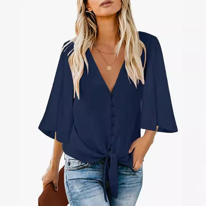 | nameOriginal | Women's casual shirt Amazon hot selling tie button top V-neck solid color shirt 2024 spring European and American |