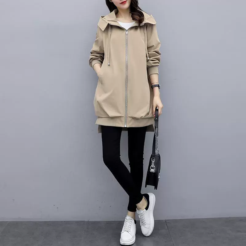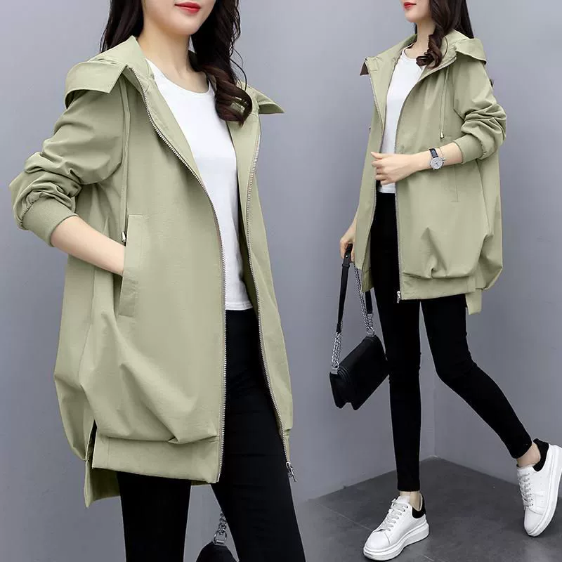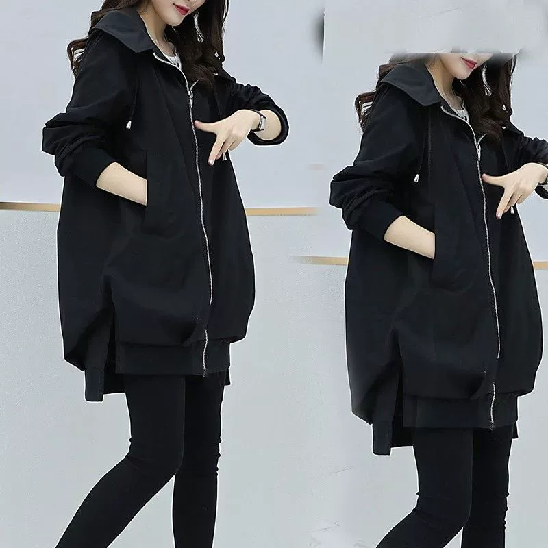 Fat mm large size women’s clothing spring and autumn Korean version hidden meat loose casual hooded trench coat for women mid-length slim temperament jacket