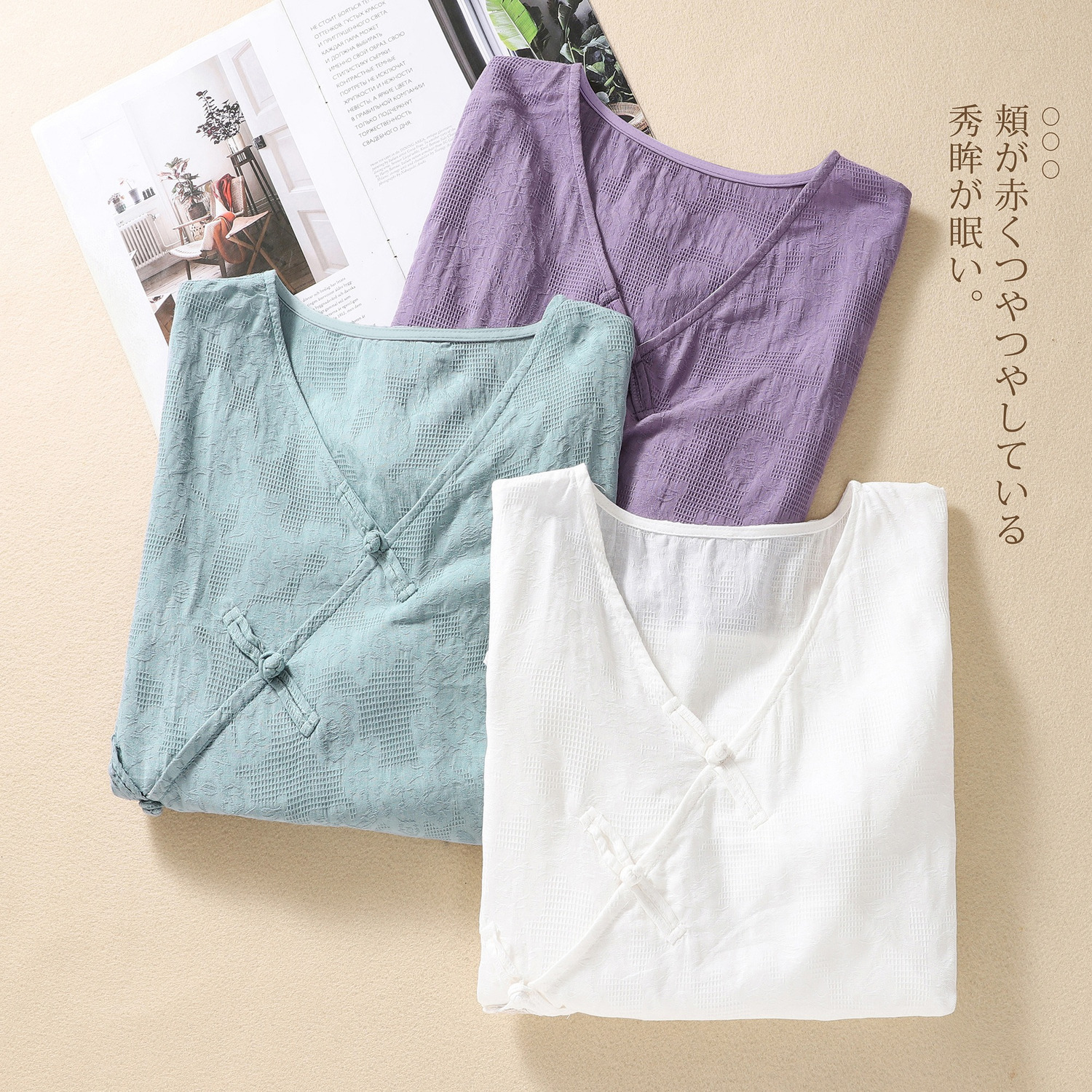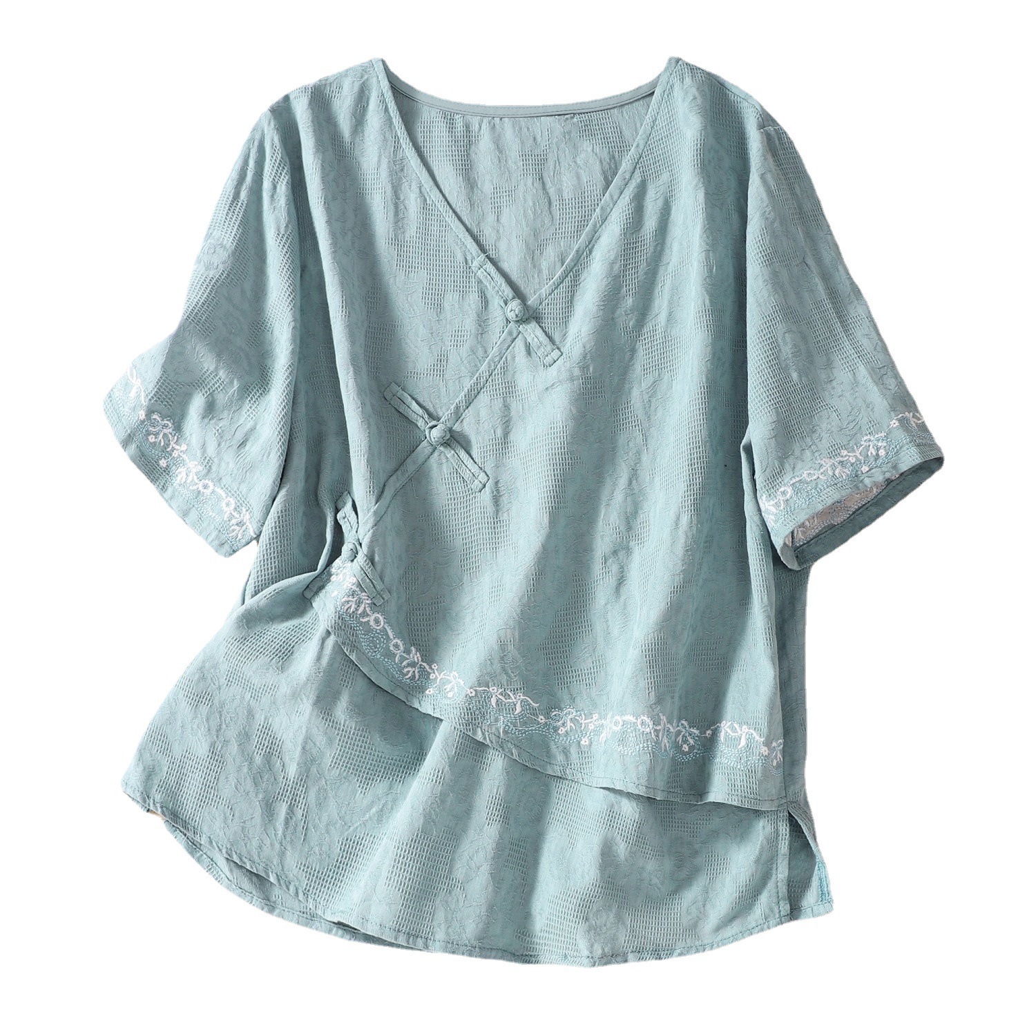| nameOriginal | Women's Clothing Summer Cotton and Linen Top Short-sleeved Women's Jacquard Embroidered Cuff Hem Slant Placket V-neck Buckle Retro Slimming T-shirt |