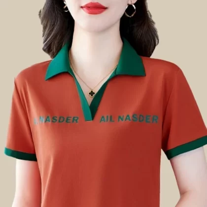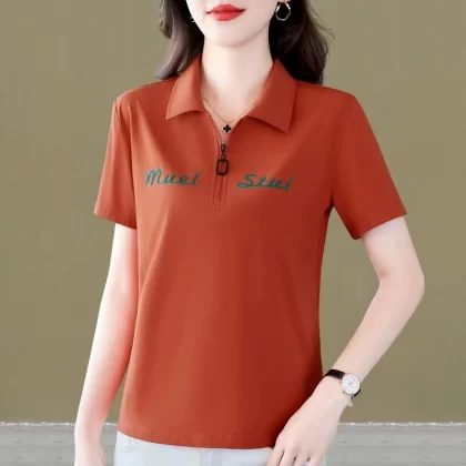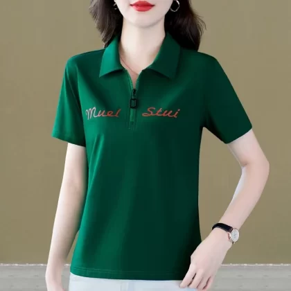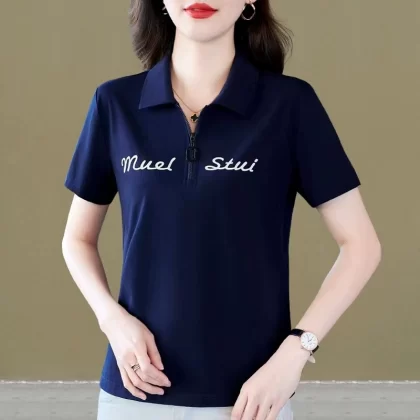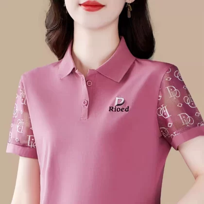 Women’s Embroidered Short Sleeve Slim Fit POLO Shirt Lapel Mesh