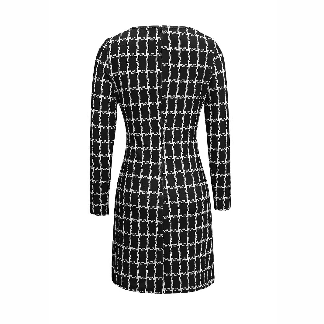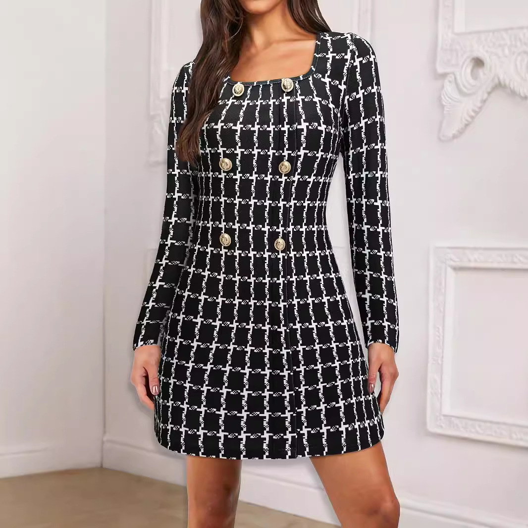 | nameOriginal | Women's European and American Women's Dress 2024 New Elegant Commuter Square Neck Plaid Printed Button Decorative Long Sleeve dress |