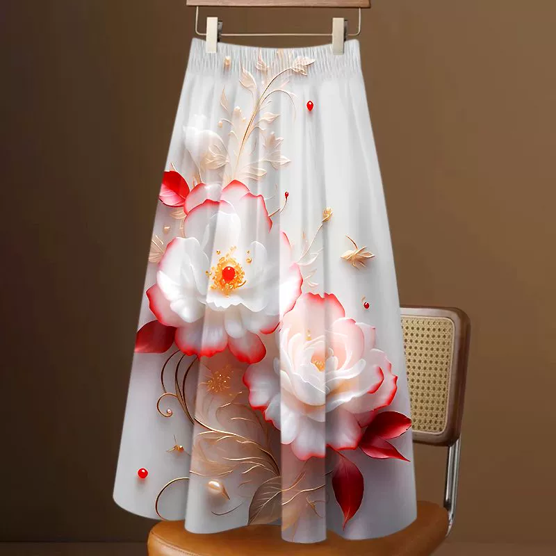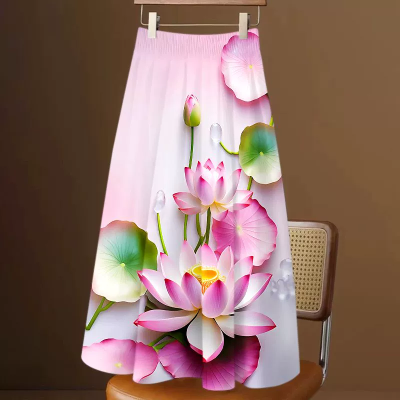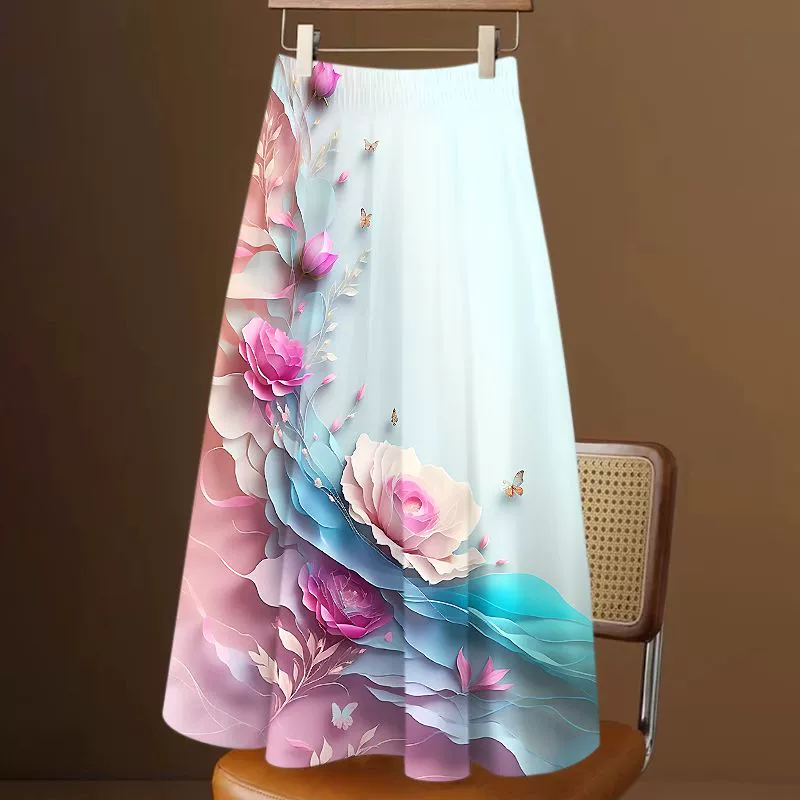 Women’s foreign gas printing, vertical sensation, meat over the knee long skirt