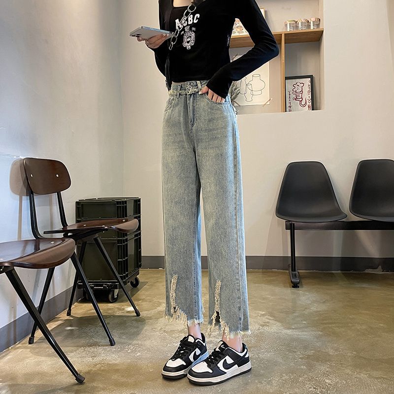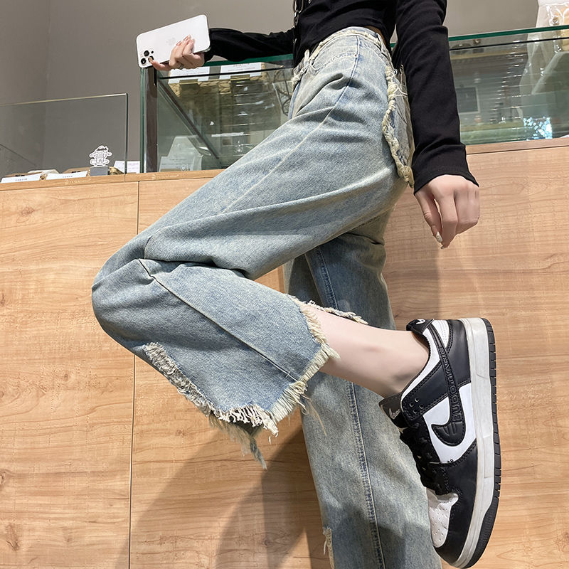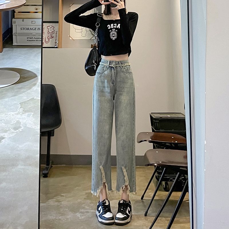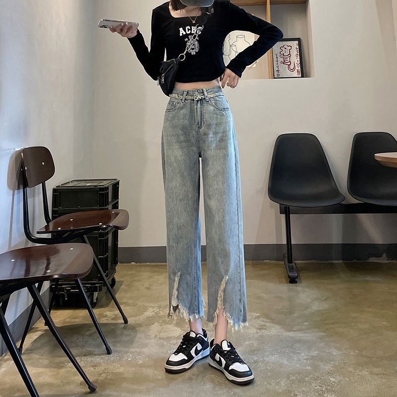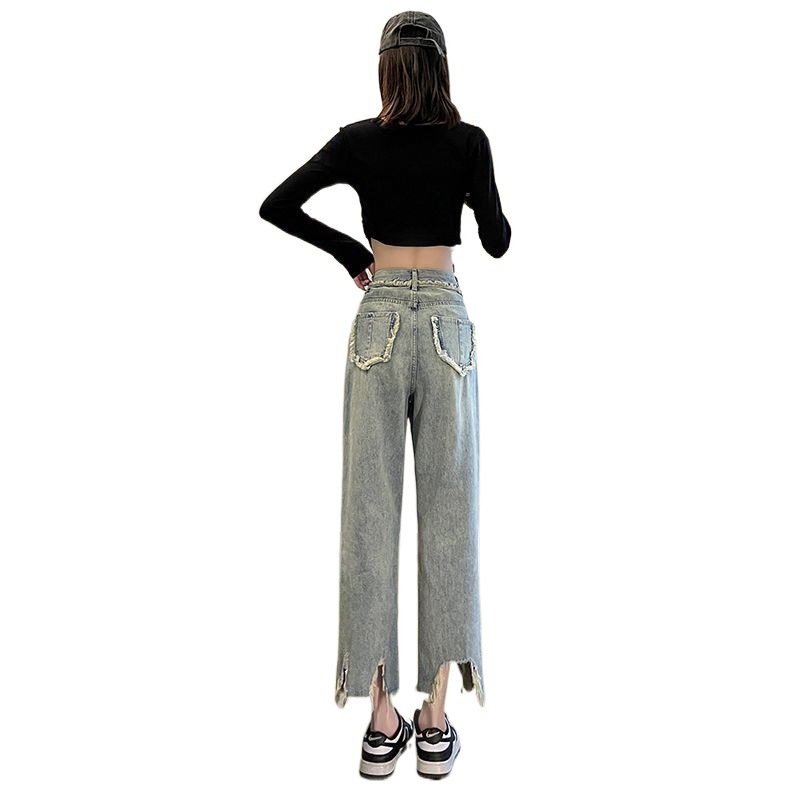 | nameOriginal | Women's frayed straight jeans Spring and Autumn 2023 New irregular retro high waist slimming cropped narrow wide leg pants |