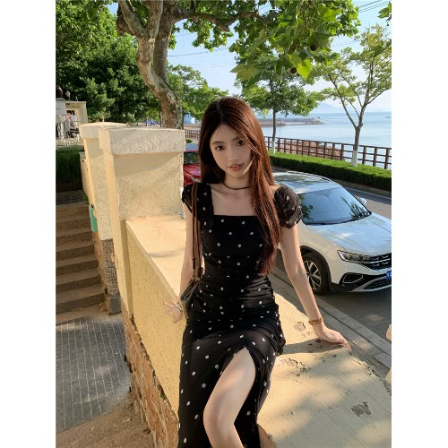 Women’s French Style Polka Dot Short Sleeve Summer Long Dress