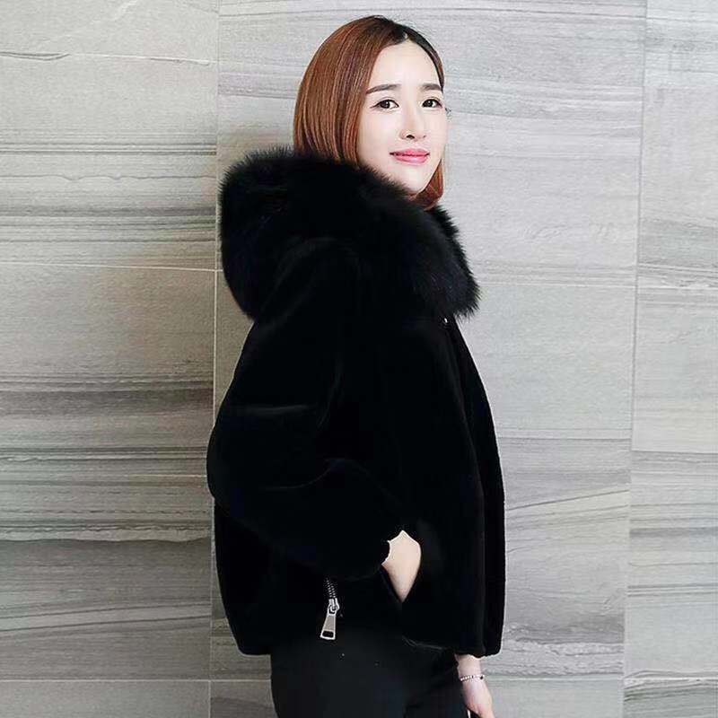 Women's Haining Imitation Sheep Hooded Coat Short Korean-style New Imitation Fox Fur Collar Fur Outer Hair