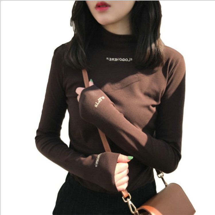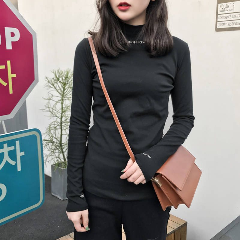 Women's Half-high Collar T-shirt Base Shirt Women's Spring Pullover Letter Embroidered Slim-fit Student Solid Color Long-sleeved T-shirt Women