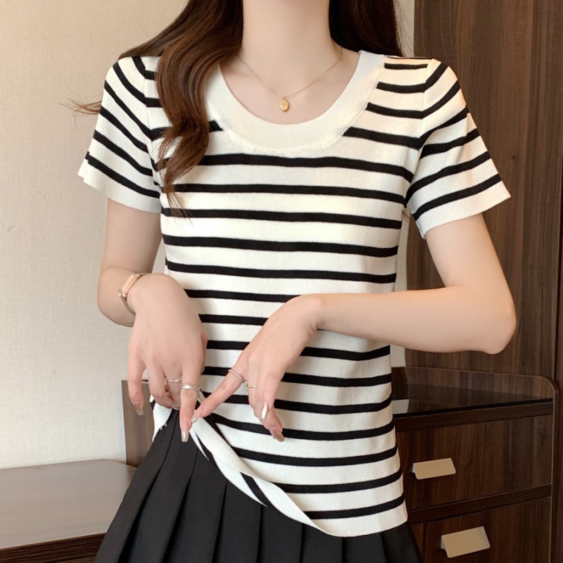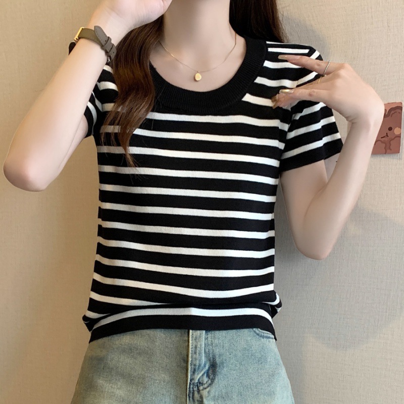 | nameOriginal | Women's in stock wholesale 2024 summer small style stitching short sleeve sweater striped top thin ice silk T-shirt |
