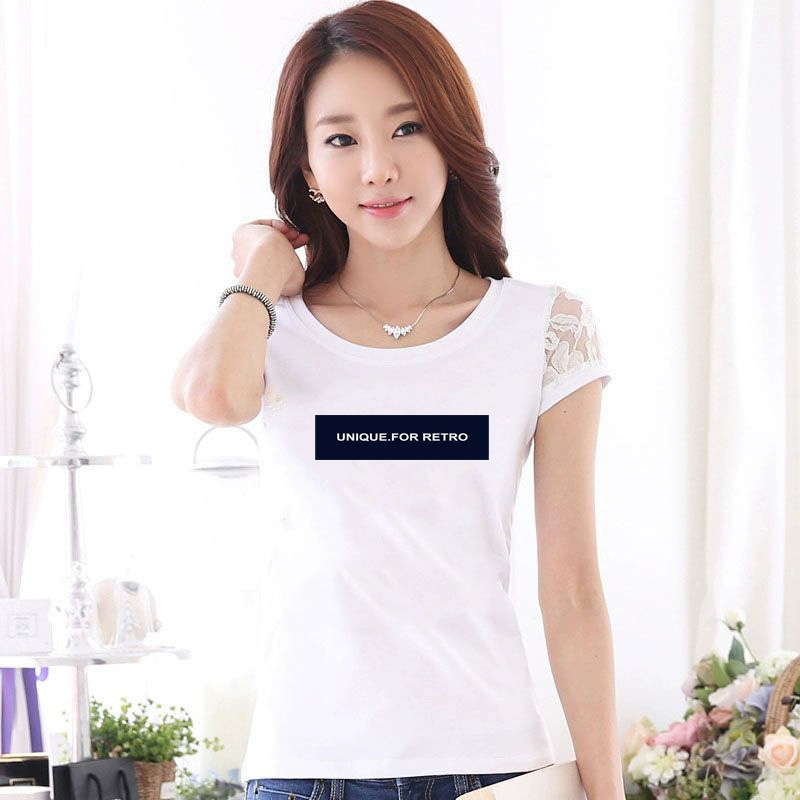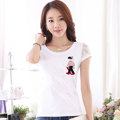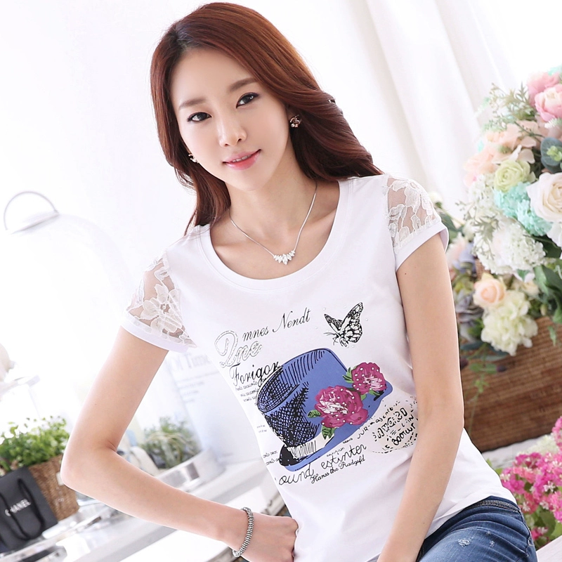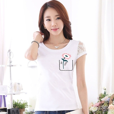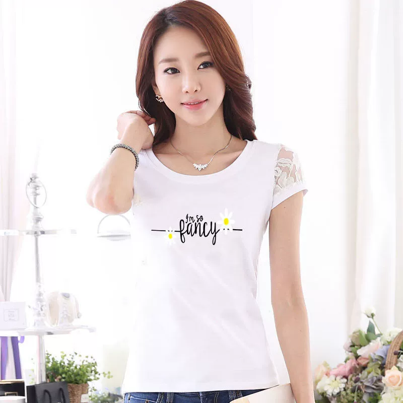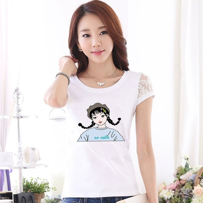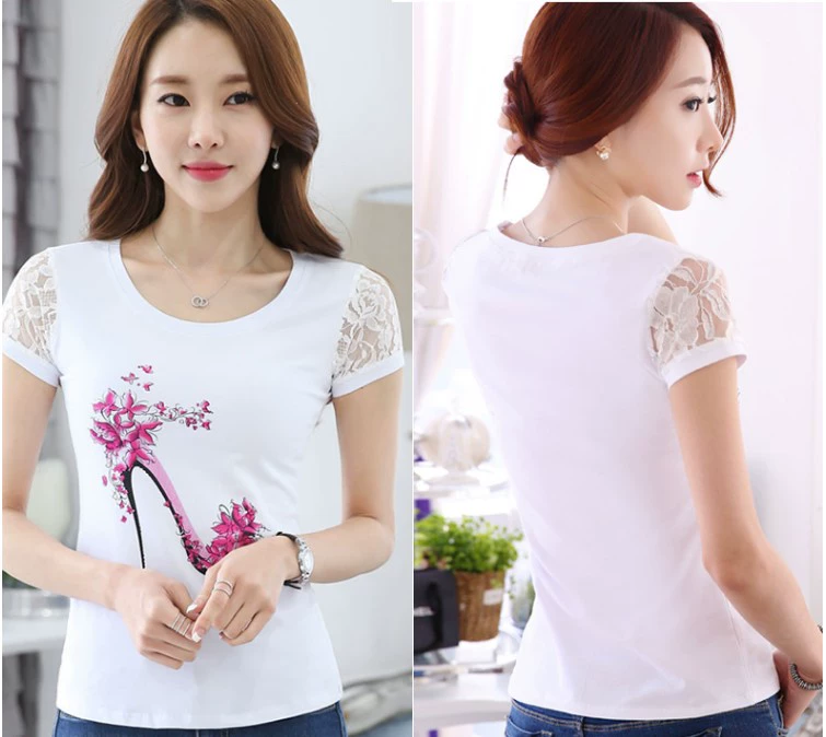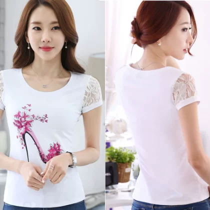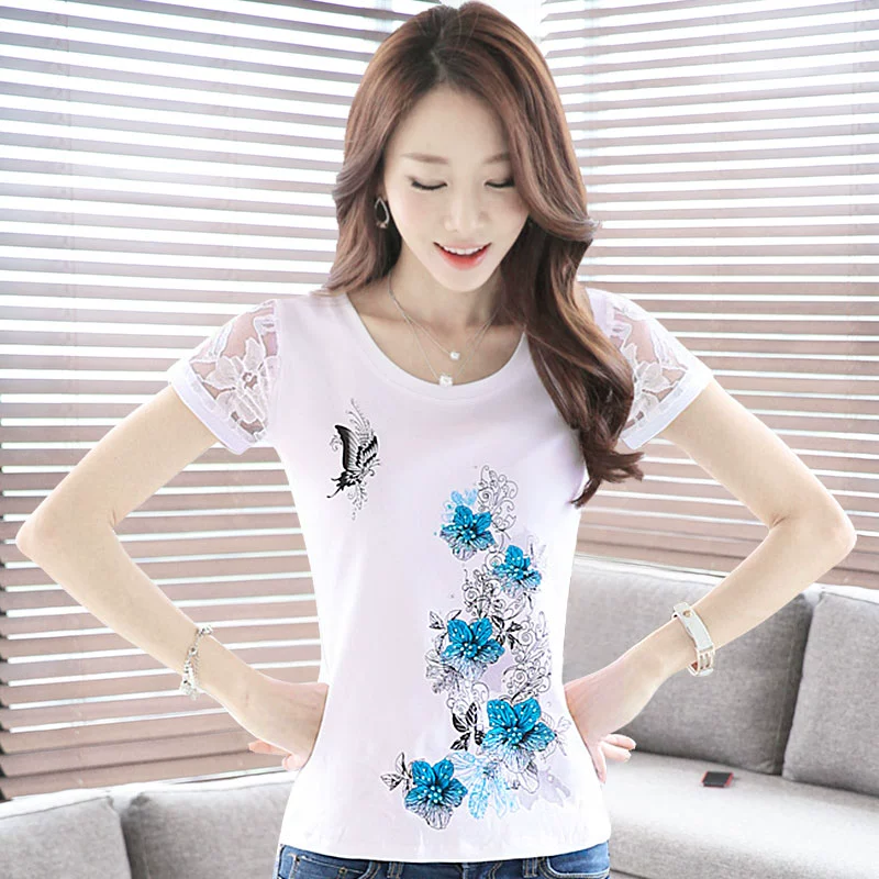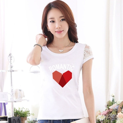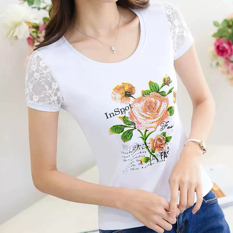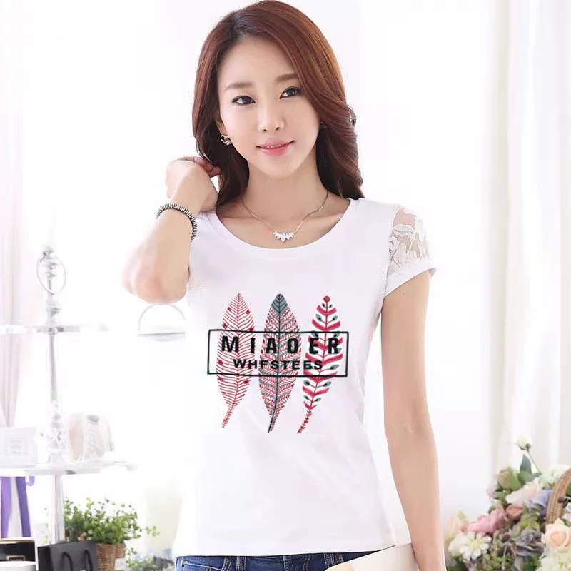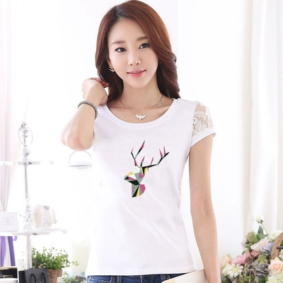 Women’s lace printed slim white short -sleeved T -shirt