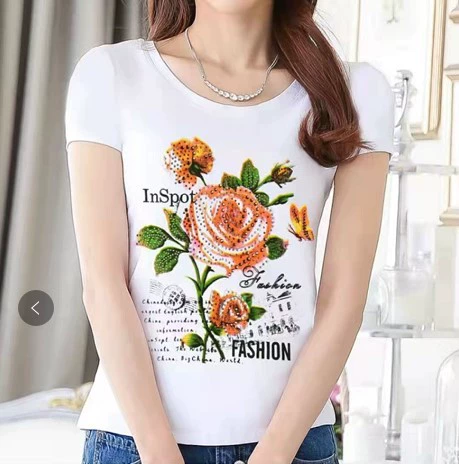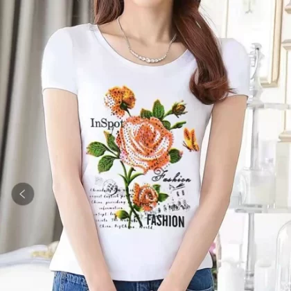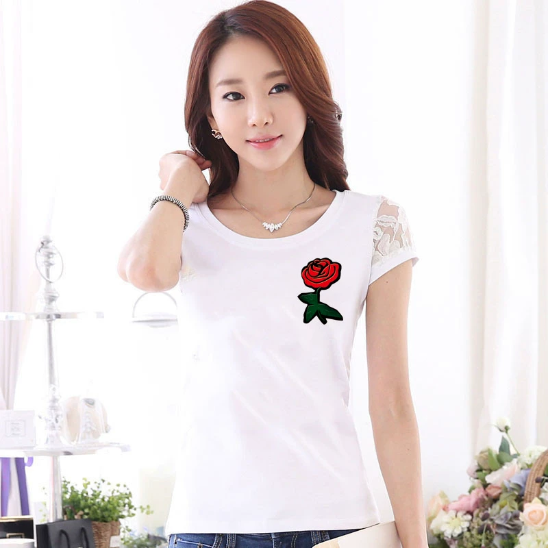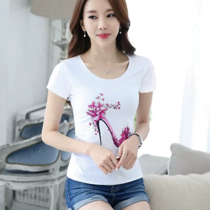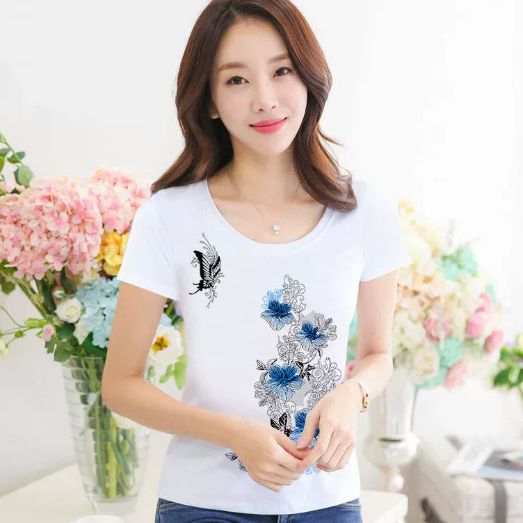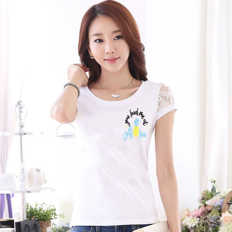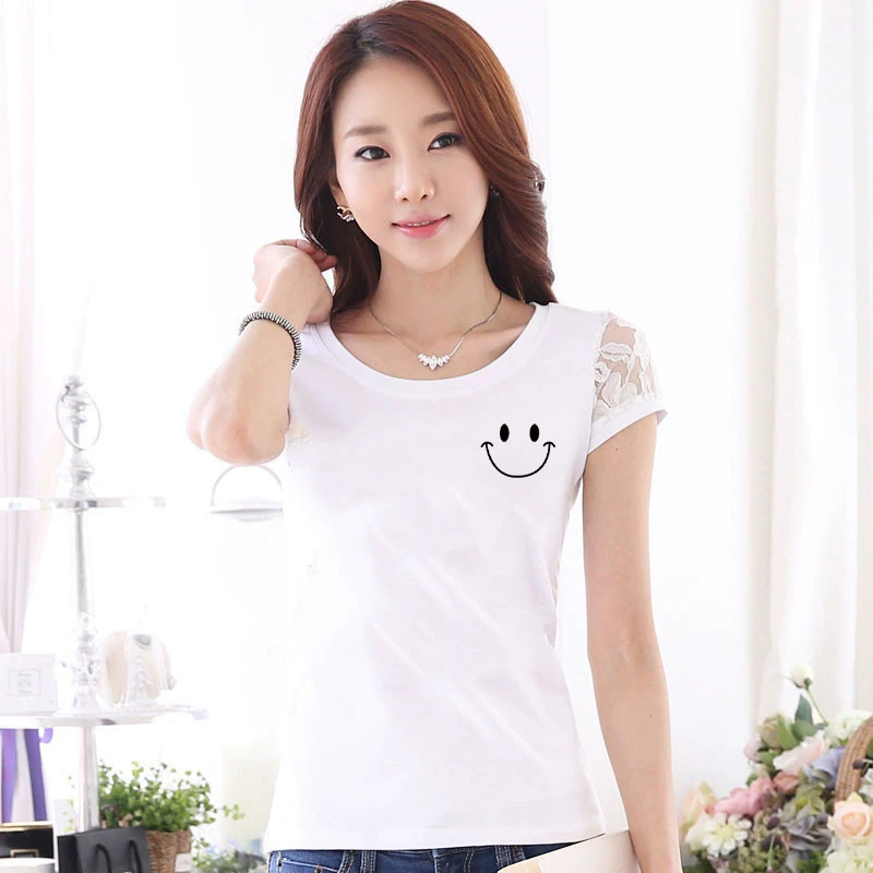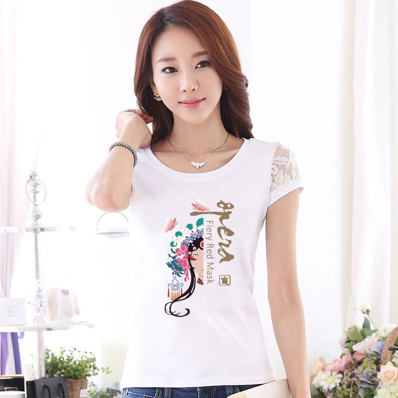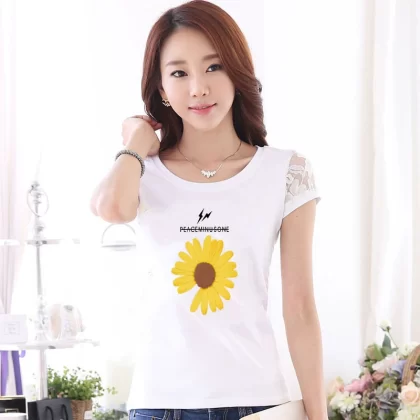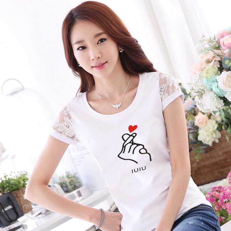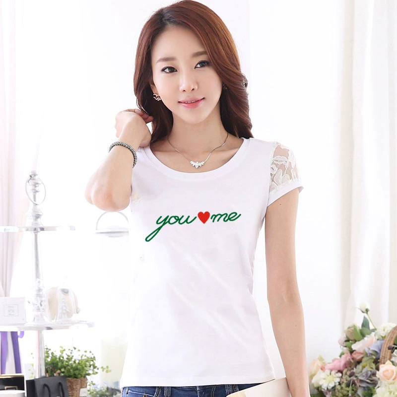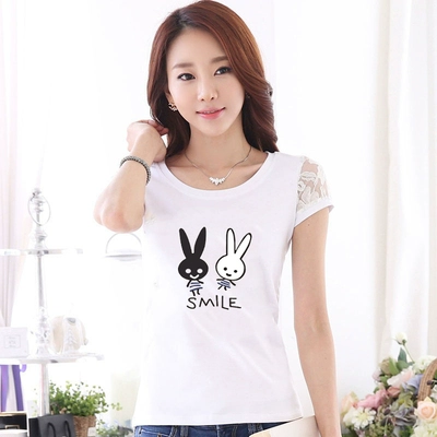 Women’s lace printed slim white short -sleeved T -shirt