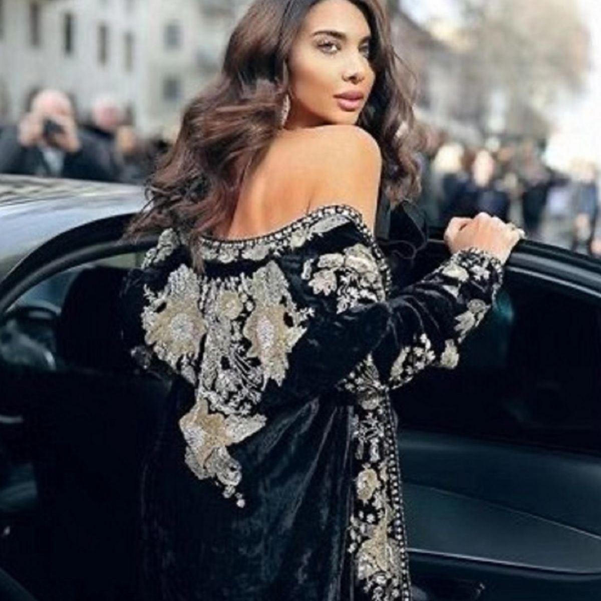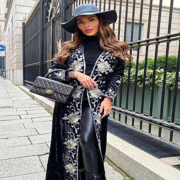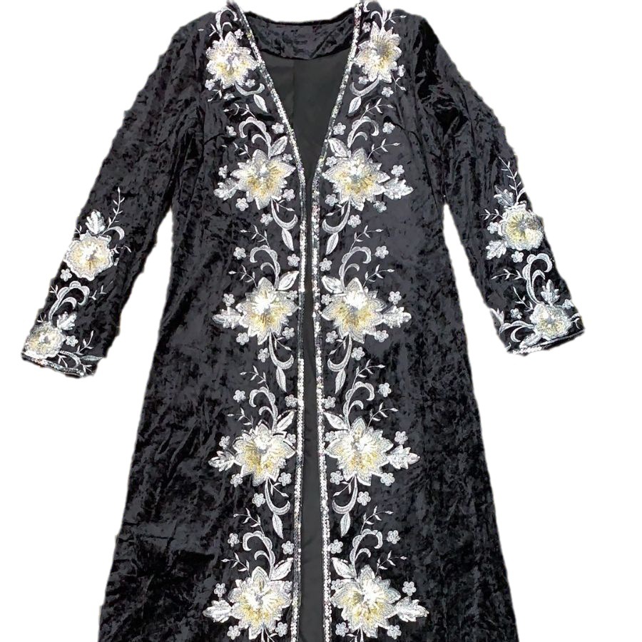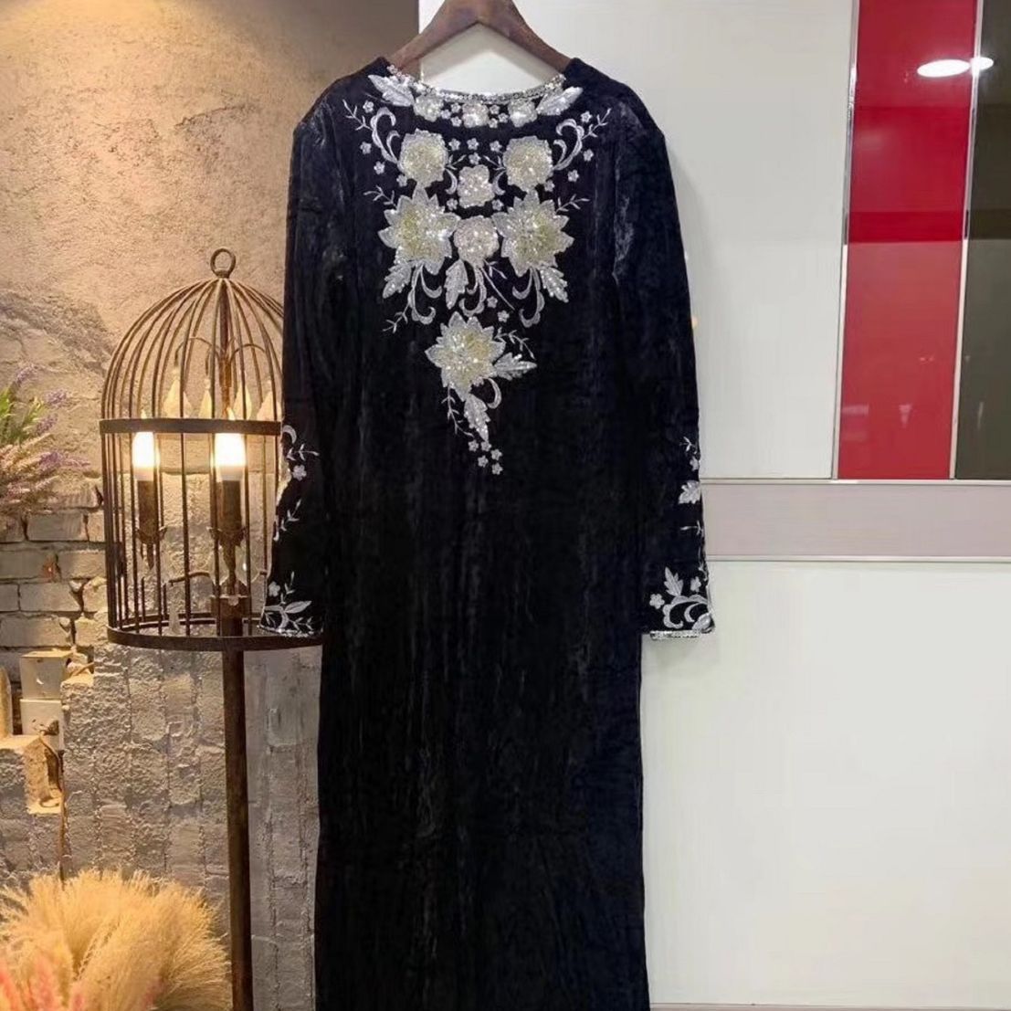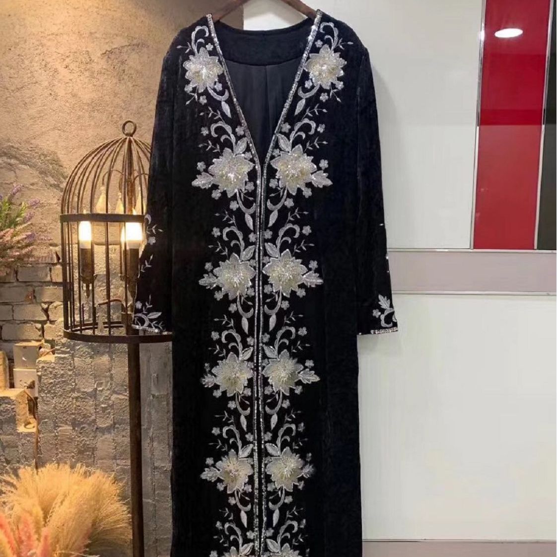 Women’s Large Print Rhinestone Dubai Middle Eastern Style Black Velvet Long-sleeved Robe Retro Elegant and Demure