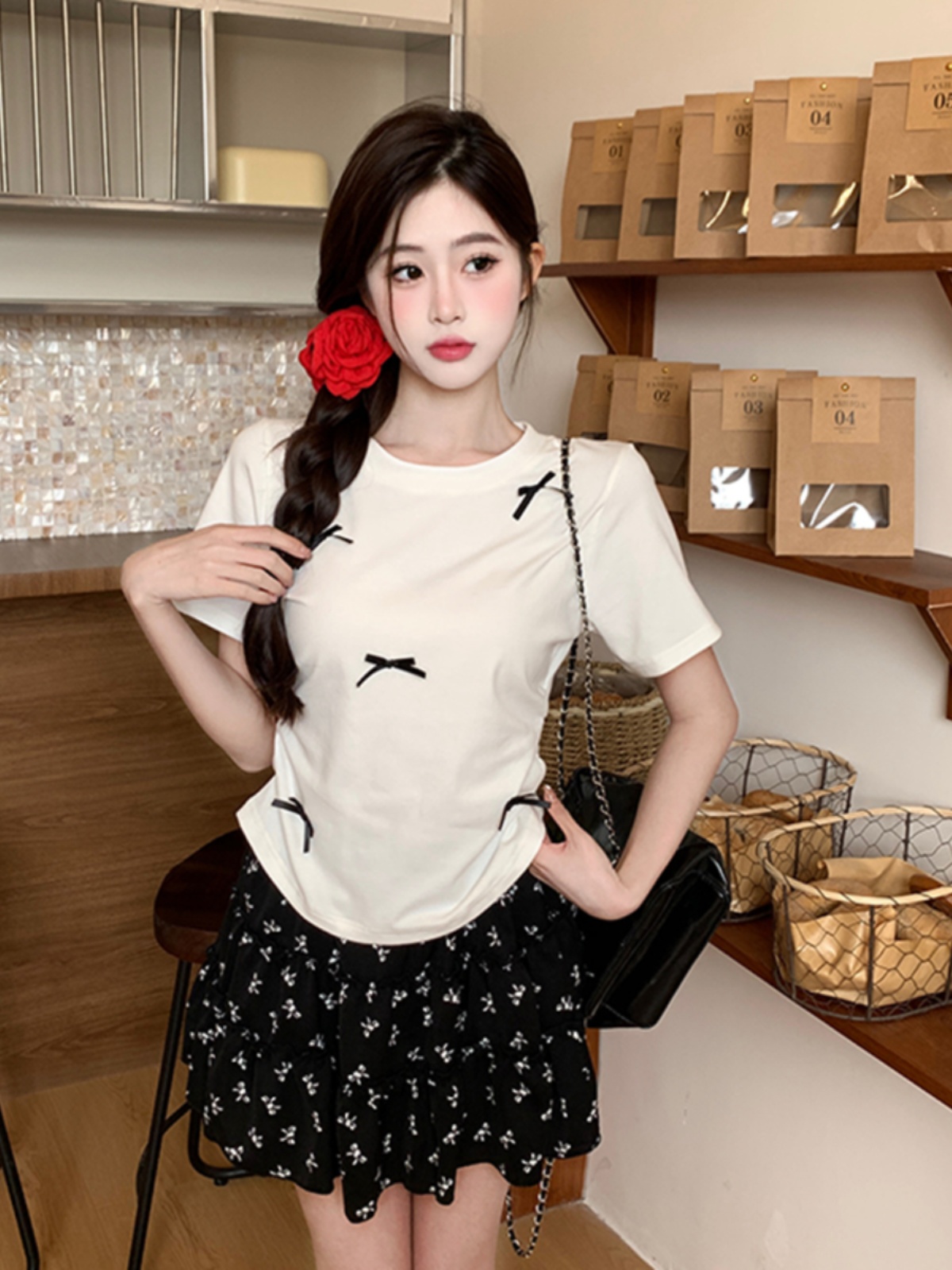 | nameOriginal | Women's large size floral skirt with flesh-covering bow |