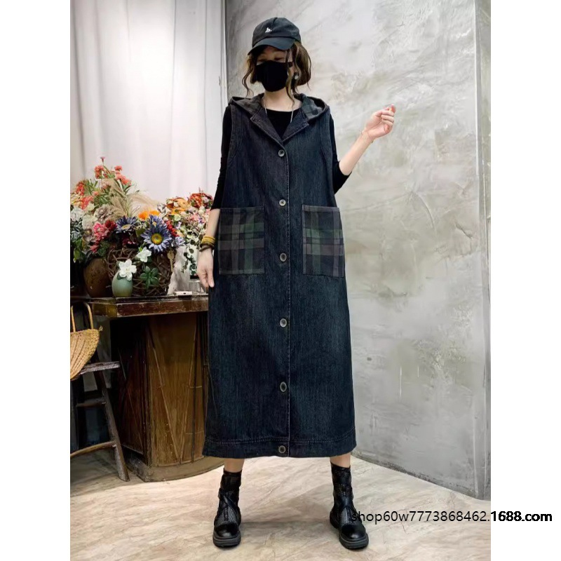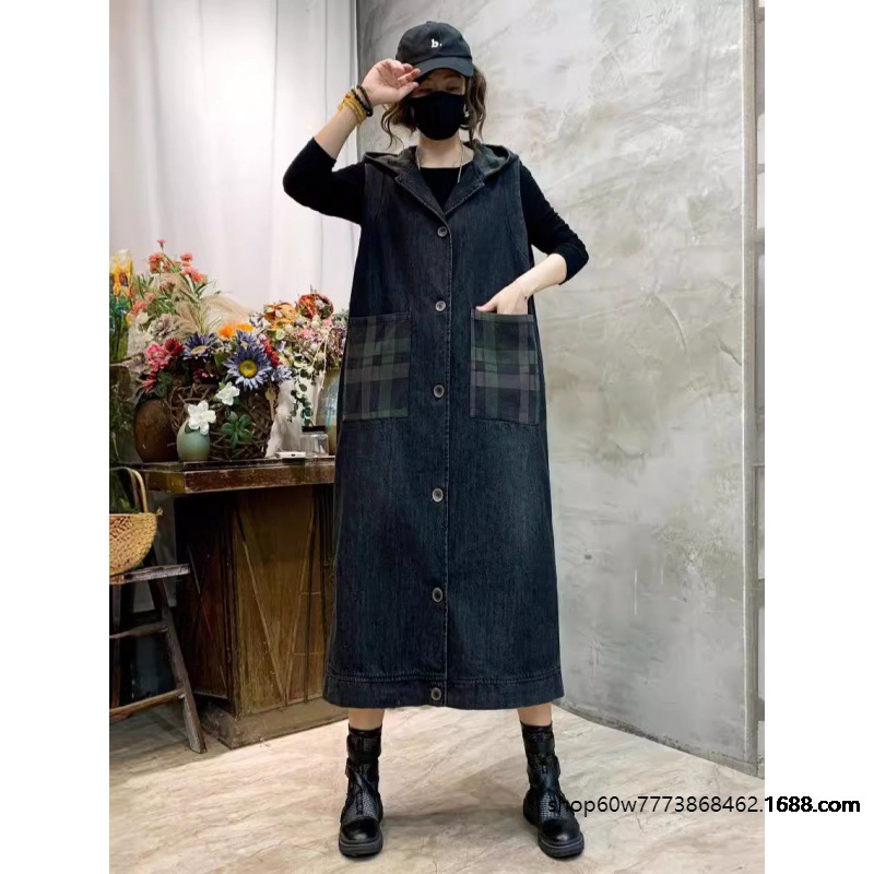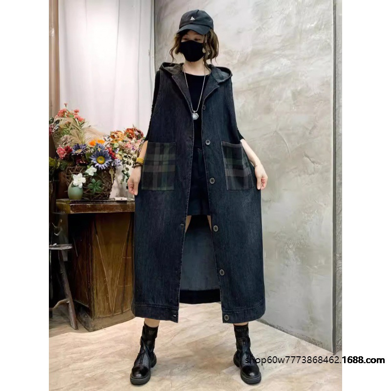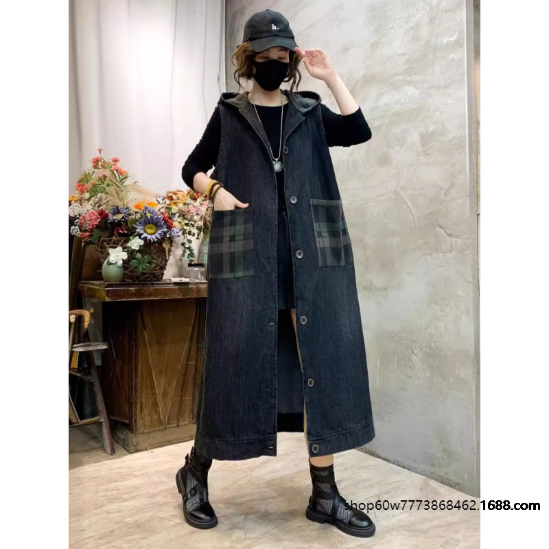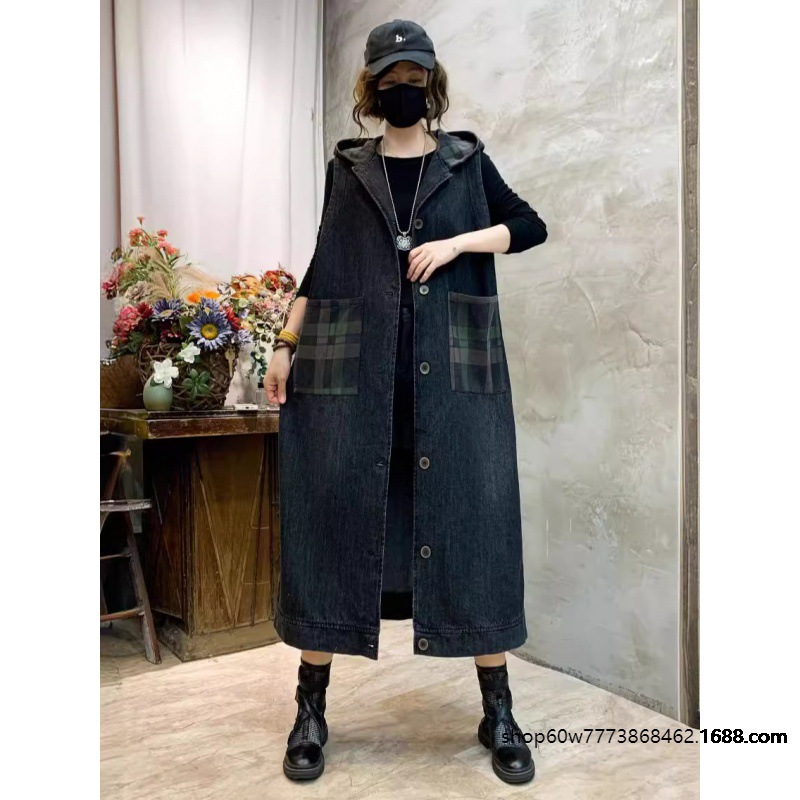 | nameOriginal | Women's Long Denim Jacket Vest 2024 Autumn New Vintage Patchwork Plaid Loose Hooded Cardigan for Women |
