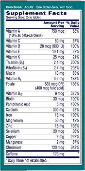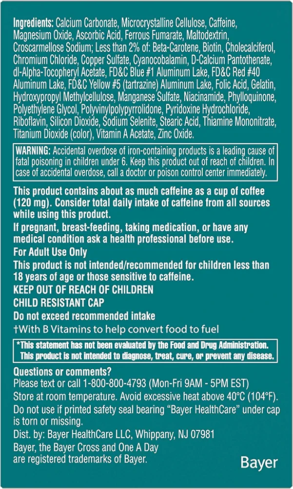 One A Day Women’s Active Metabolism is a comprehensive multivitamin designed to aid in the conversion of food and drink into energy. It includes specific ingredients to support metabolism and essential nutrients such as Calcium and Vitamin D to promote bone strength. This product is backed by the Bayer HealthCare – Consumer Health 60-Day Satisfaction Guarantee and is recommended to be taken once daily with food.