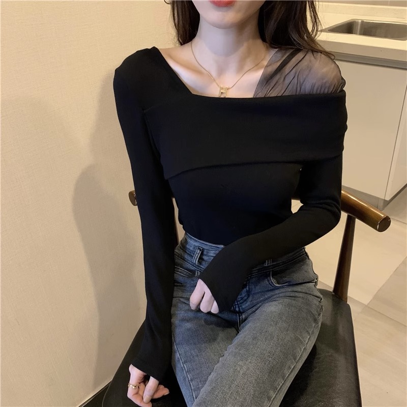 Women’s patchwork mesh long-sleeved T-shirt autumn and winter thickened solid color slim top cross-border women’s clothing foreign trade wholesale Amazon