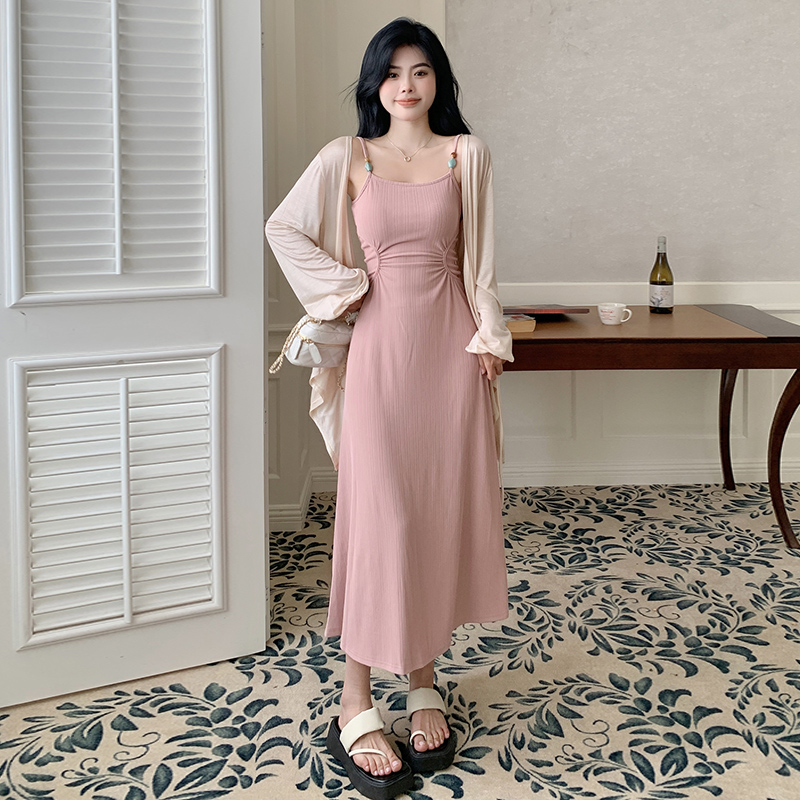 Women’s large size pure pink cardigan fat mm suspender skirt