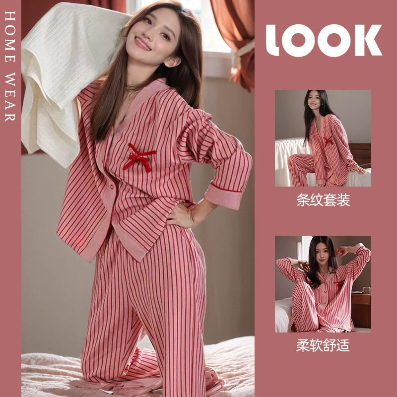 Women’s pure cotton V-neck pink bow home wear pajamas