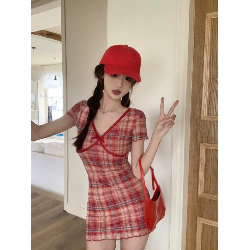| nameOriginal | Women's red plaid summer slim mesh dress |